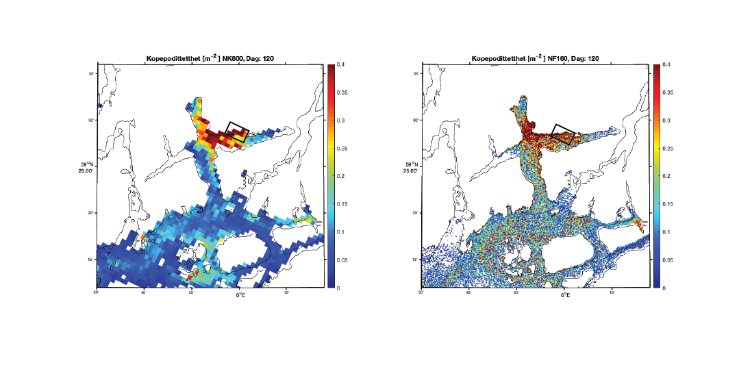 Figur 5. Konsentrasjon av kopepoditter den 29. juni 2019 beregnet med 800m-modellen (venstre) og 160m-modellen (høyre). Den svarte firkanten markerer et areal vi viser tidsserier fra i Figur 2 og 3 under.
