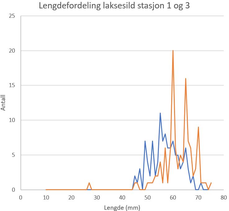 Figur 8: Lengdefordeling av laksesild fra trålstasjon 1(blå) og 3 (rød). For det meste besto prøvene av voksen laksesild.
