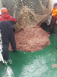 Fangst: En times tråling på et mesopelagisk lag ga en fangst på ca 200 kg; om lag 80 % krill og 20 % laksesild, samt 2 kolmuler.Se figurene 2 – 4.