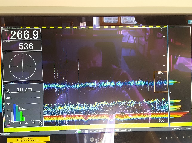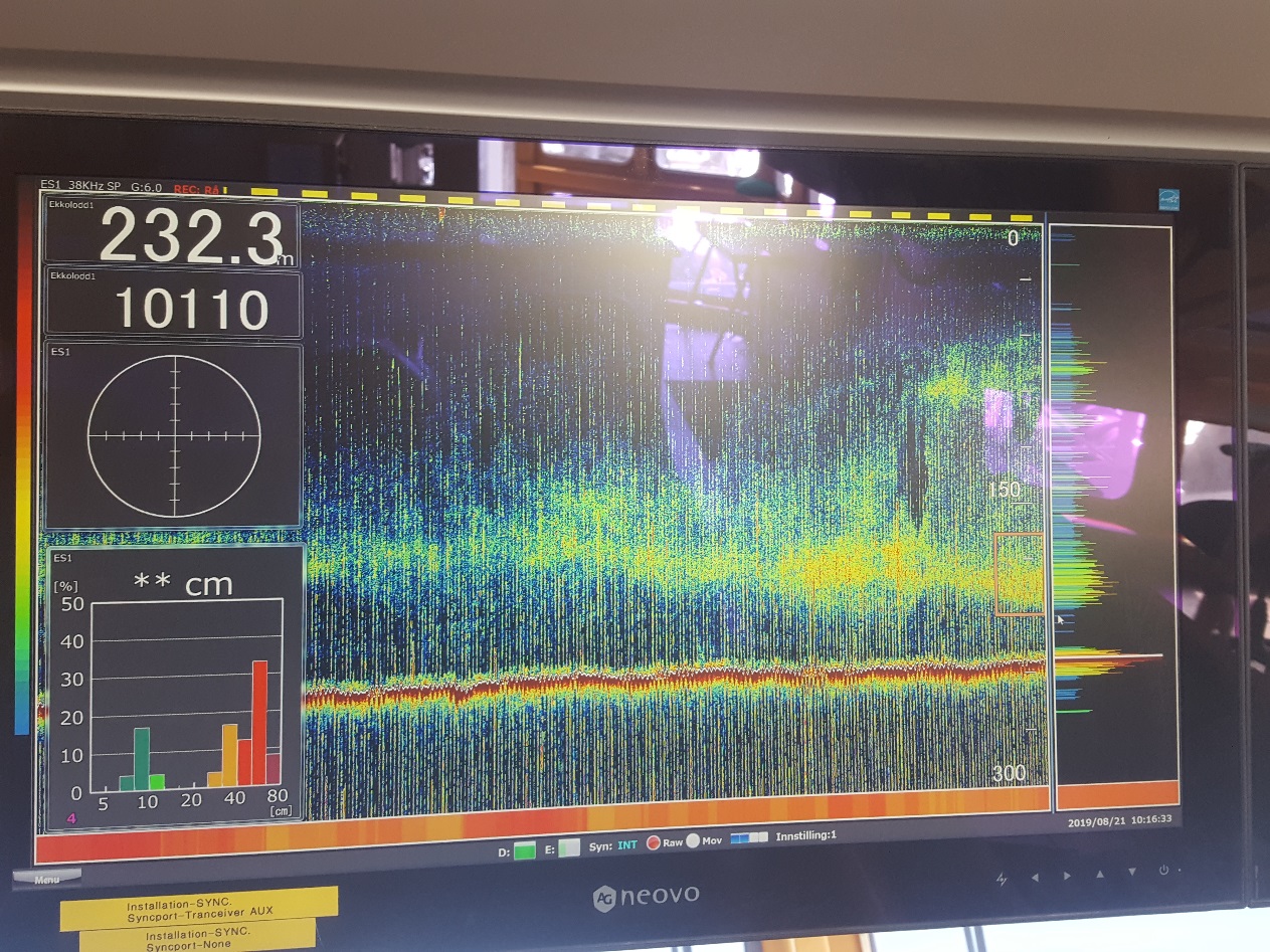 18.08.19: Krysset Norskerenna og begynte å leite etter forekomster av mesopelagisk fisk i vestkanten av Norskerenna. Krysset nordover fra posisjon vest for Egersund på dyp mellom 200- og 250m.