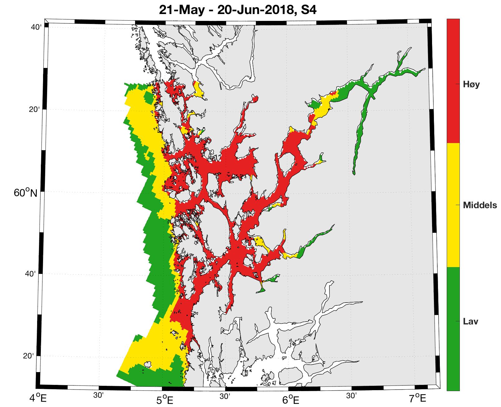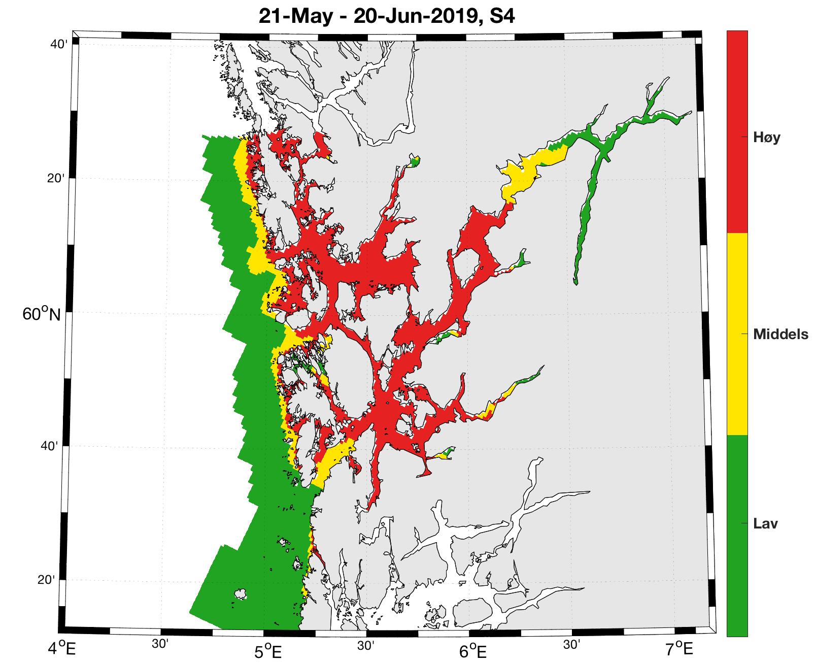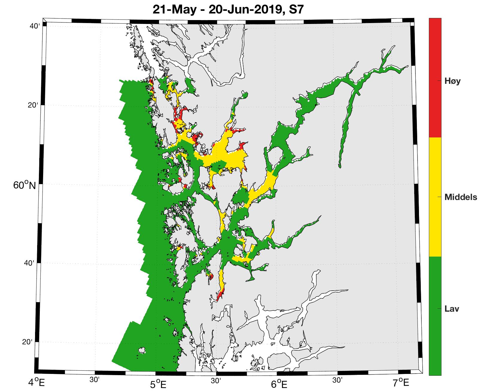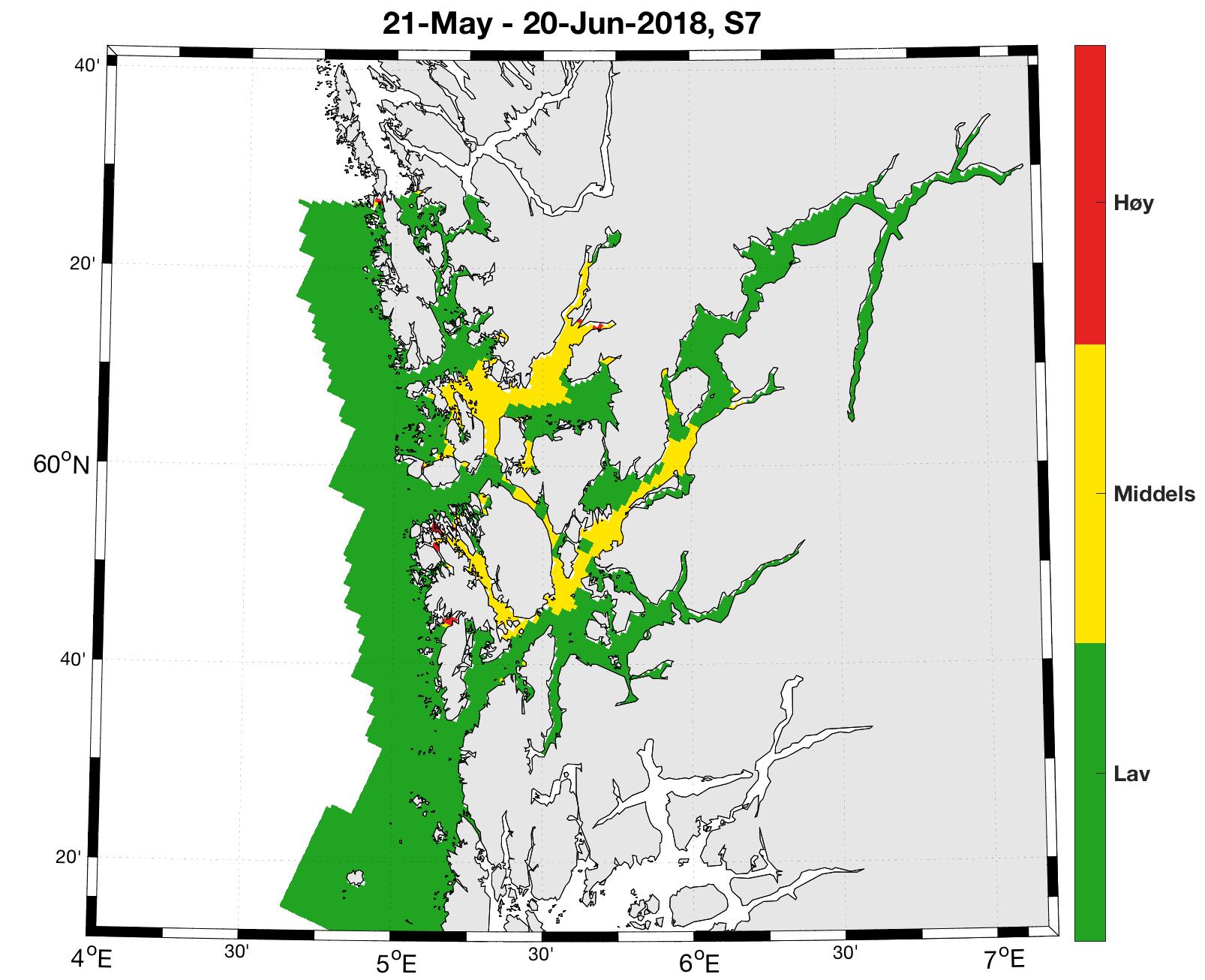 Figur 7. ROC kart som viser områder der det er forventet at villfisk som står i området i den definerte perioden vil få på seg mer enn 6 lus (rød farge), mellom 2 og 6 lus (gul farge) og mindre enn 2 lus (grønn farge). Utslippet er beregnet ut ifra at alle anleggene har konstant antall lus som følger S4 (0,2 APF), S5 (0,1 APF), S6 (0,05 APF) og S7 (0,01 APF).