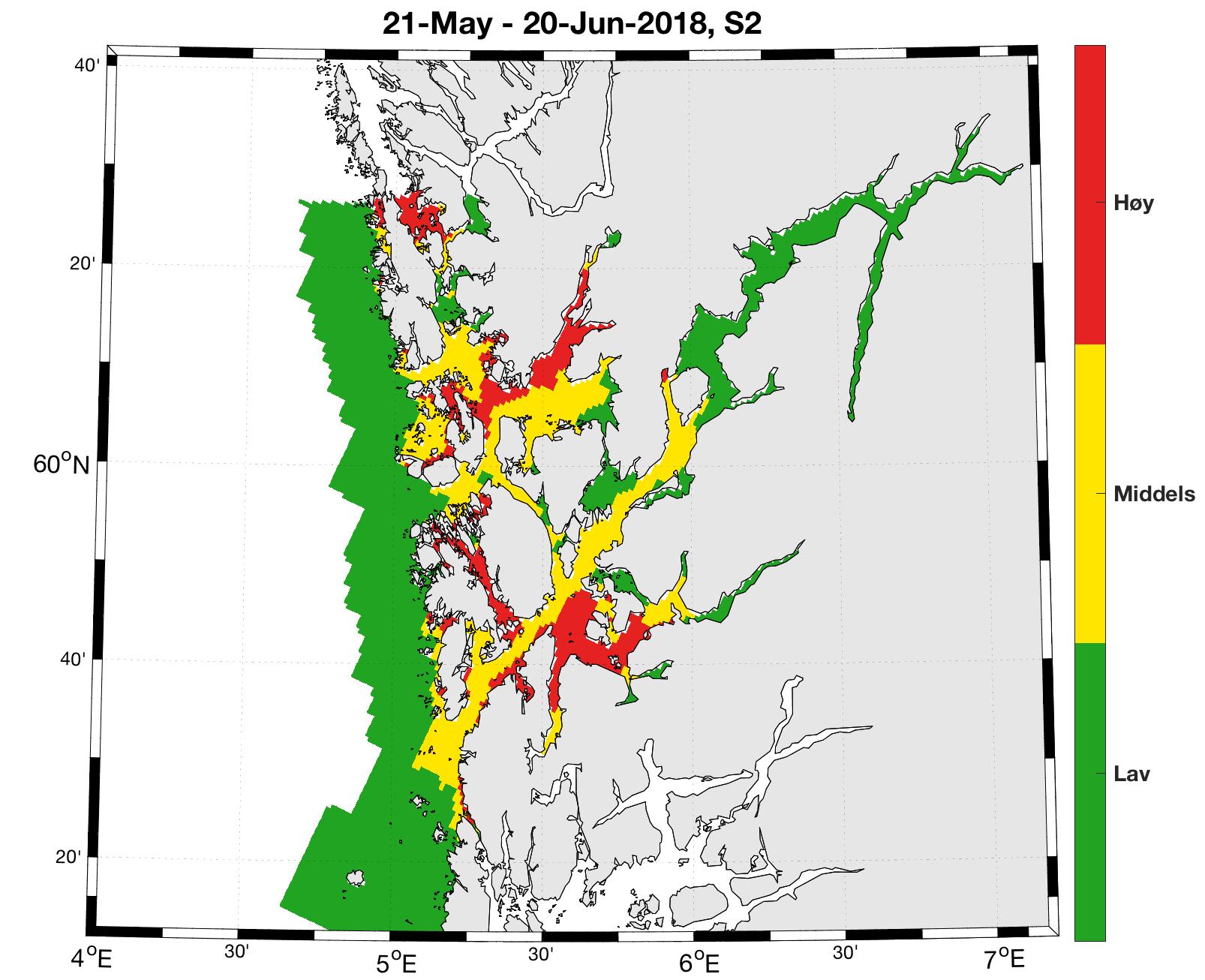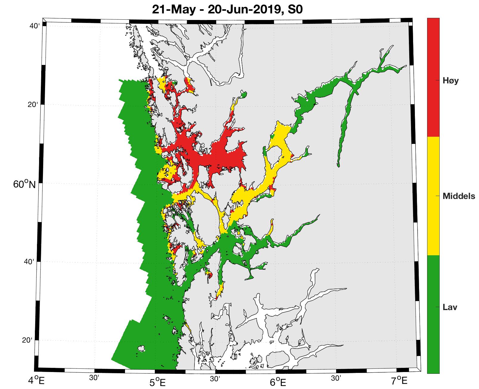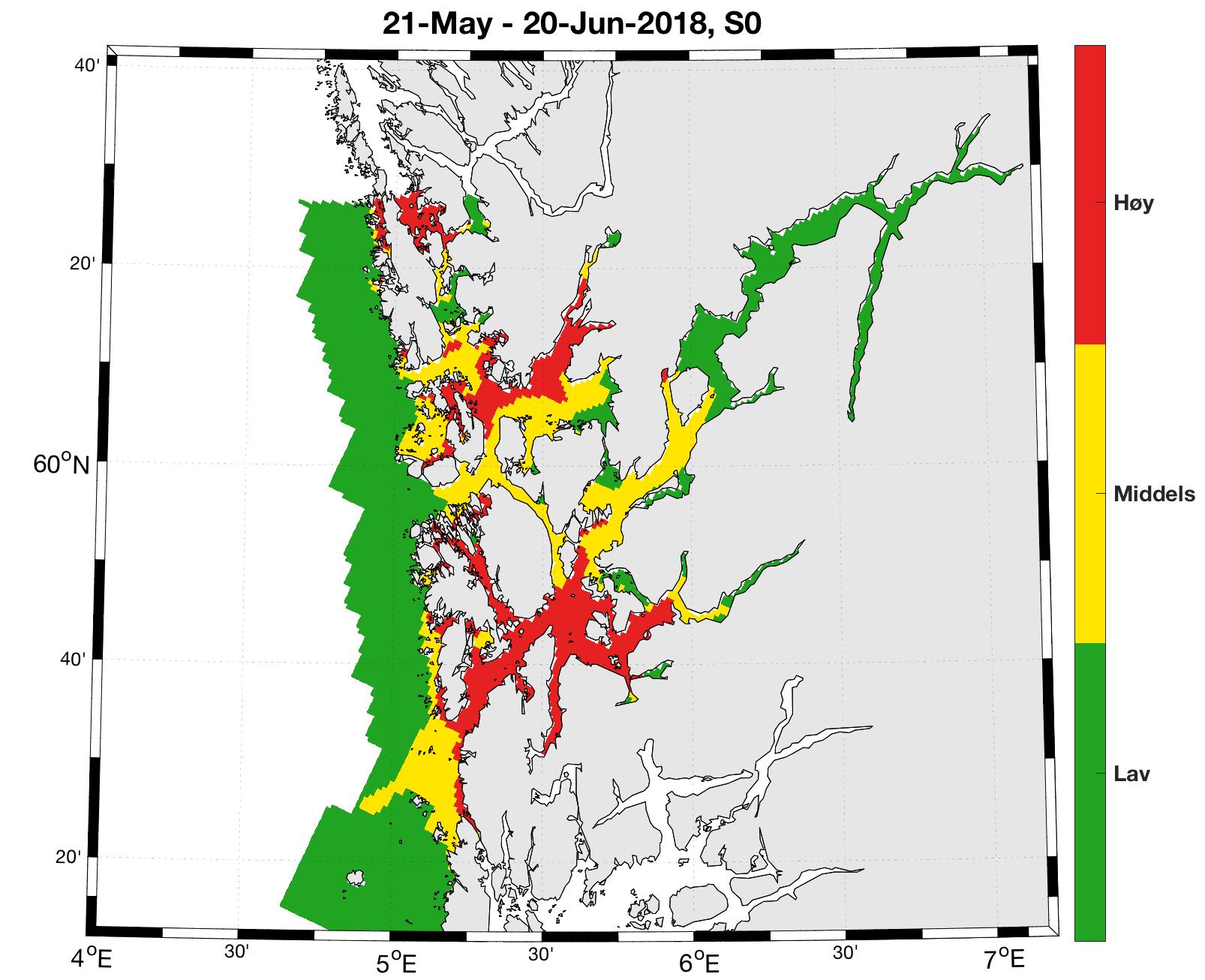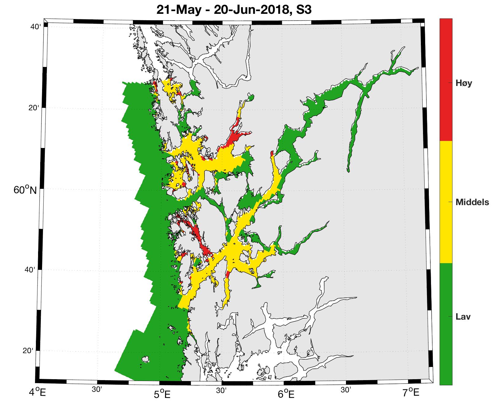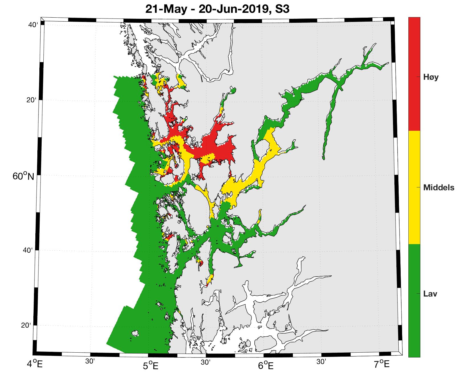 Figur 7. ROC kart som viser områder der det er forventet at villfisk som står i området i den definerte perioden vil få på seg mer enn 6 lus (rød farge), mellom 2 og 6 lus (gul farge) og mindre enn 2 lus (grønn farge). Utslippet er beregnet ut ifra at alle anleggene har konstant antall lus som følger S4 (0,2 APF), S5 (0,1 APF), S6 (0,05 APF) og S7 (0,01 APF).