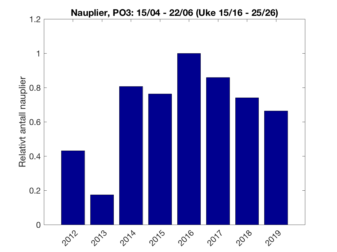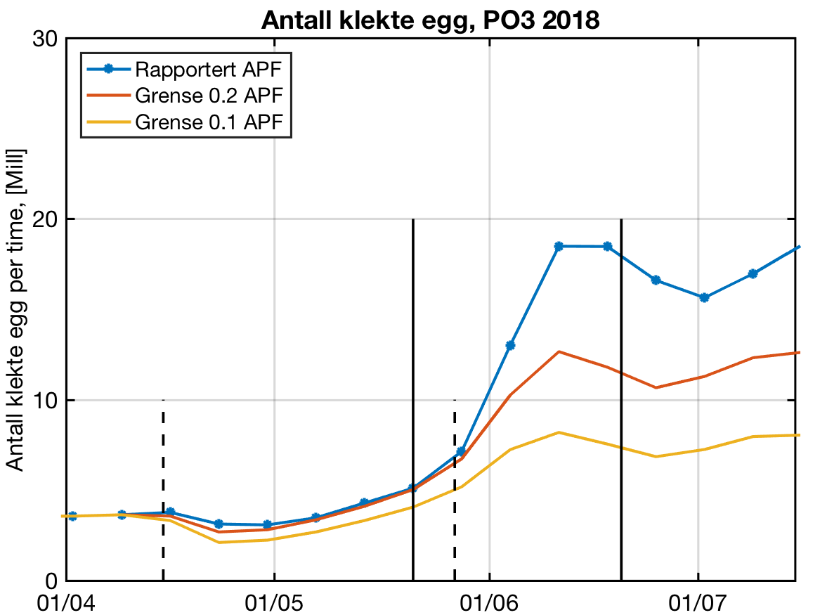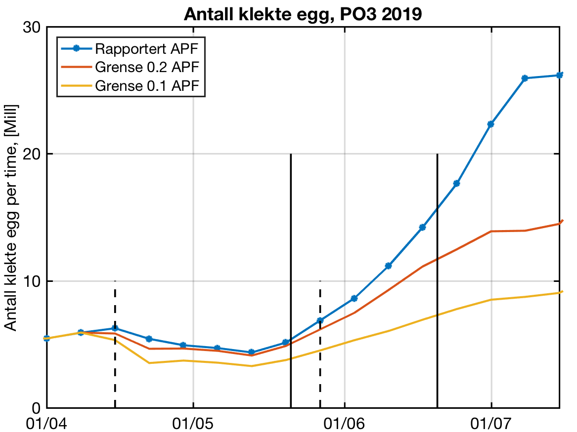 En opptelling av antall anlegg med mer enn 0.2 voksne hunnlus per fisk viste at de fleste oppdrettsanleggene i PO3 holdt seg godt under 0.2 APF i ukene 16 - 21 i både 2018 og 2019. Fra uke 21 og utover økte antallet noe, men fortsatt i uke 26 var det under 25% av anleggene som rapporterte om mer enn 0.2 APF. Det vites ikke hvorfor noen anlegg tidvis overskred grensen på 0.2 APF i uke 16-21.