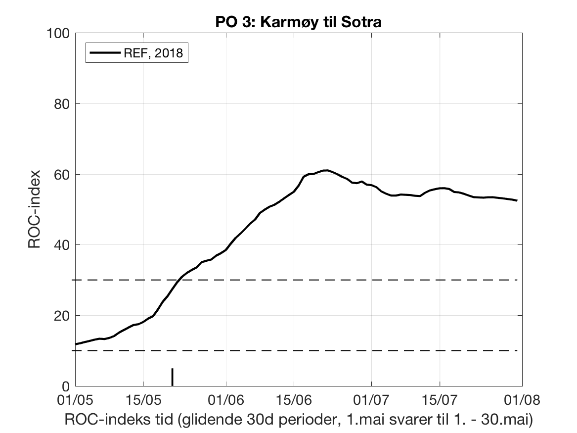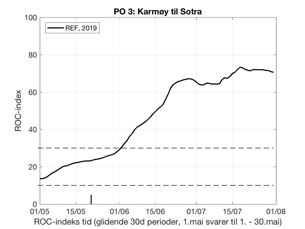 I trafikklysvurderingen ble en serie av ROC-indekser beregnet for glidende 30 dagers perioder, som vist for 2018 og 2019 i figur 1, der horisontale stiplete linjer indikerer grenseverdiene mellom de tre kategoriene (lav, middel og køy påvirkning) som er benyttet i vurderingen. Verdien som representere perioden fra antatt dato for median utvandring av postsmolt i området og 30 dager frem tid er markert med vertikal heltrukket linje, og er videre i denne rapporten benevnt ROC-indeks perioden ( 21.mai – 20.juni for PO3) . Dette er samme periode som er benyttet i trafikklysvurderingen, der variasjonen i indeksen rundt denne perioden ble benytte til å si noe om usikkerheten. ROC-indeksen stiger vanligvis utover våren og sommeren, slik at om vi hadde valgt en tidligere periode ville indeksen blitt lavere. Det samme ville være tilfelle om vi hadde valgt en kortere periode, mens det å avgrense arealet til mindre enn 9.6km fra kysten vik øke indeksen.
