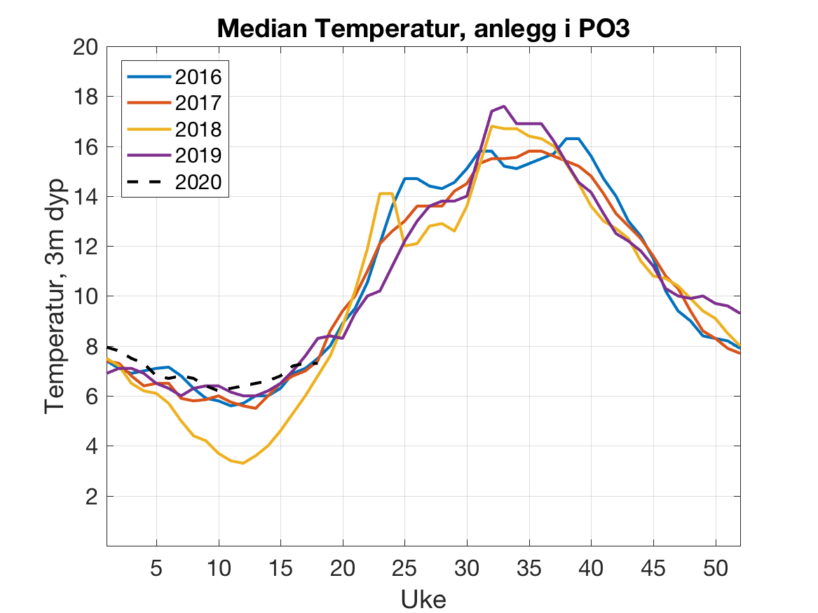 Figur 3. Beregnet median av temperatur observert i 3m dyp ved alle rapporteringspliktige anlegg i PO3.