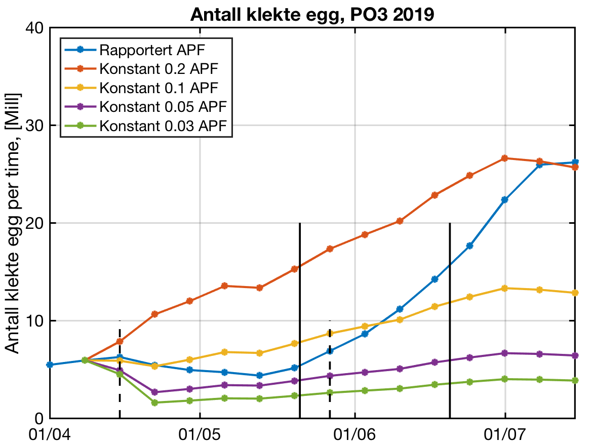 Effekten av S2 og S3 på antall klekte egg er vist uke for uke i figur 4. Samlet for perioden 15.april – 20.juni ville en overholdt lusegrense på 0.2 APF føre til 21% og 13% redusert utslipp av nauplier i henholdsvis 2018 og 2019. En lusegrense på 0.1 APF ville tilsvarende ha ført til reduksjon i utslippene på 43% og 36%.