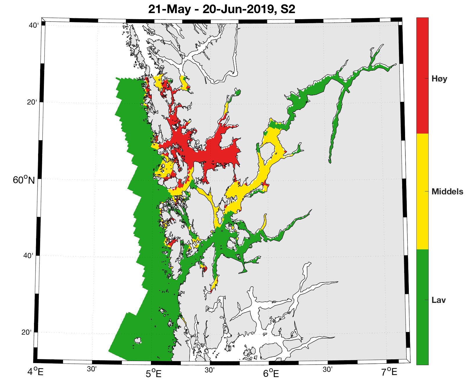 En analyse av antall voksne hunnlus per fisk viste at de aller fleste anleggene hadde et lavt lusenivå i uke 16-21. Fra uke 21 steg antallet anlegg med mer enn 0.2 voksne hunnlus per fisk noe, både i 2018 og 2019. Siden lakseluslarvene kan leve lenge i vannmassene er det antatt at utslipp i hele perioden fra 15. april til 20 juni kan påvirke ROC-indeksen som erberegnet fra 21. mai – 20. juni.
