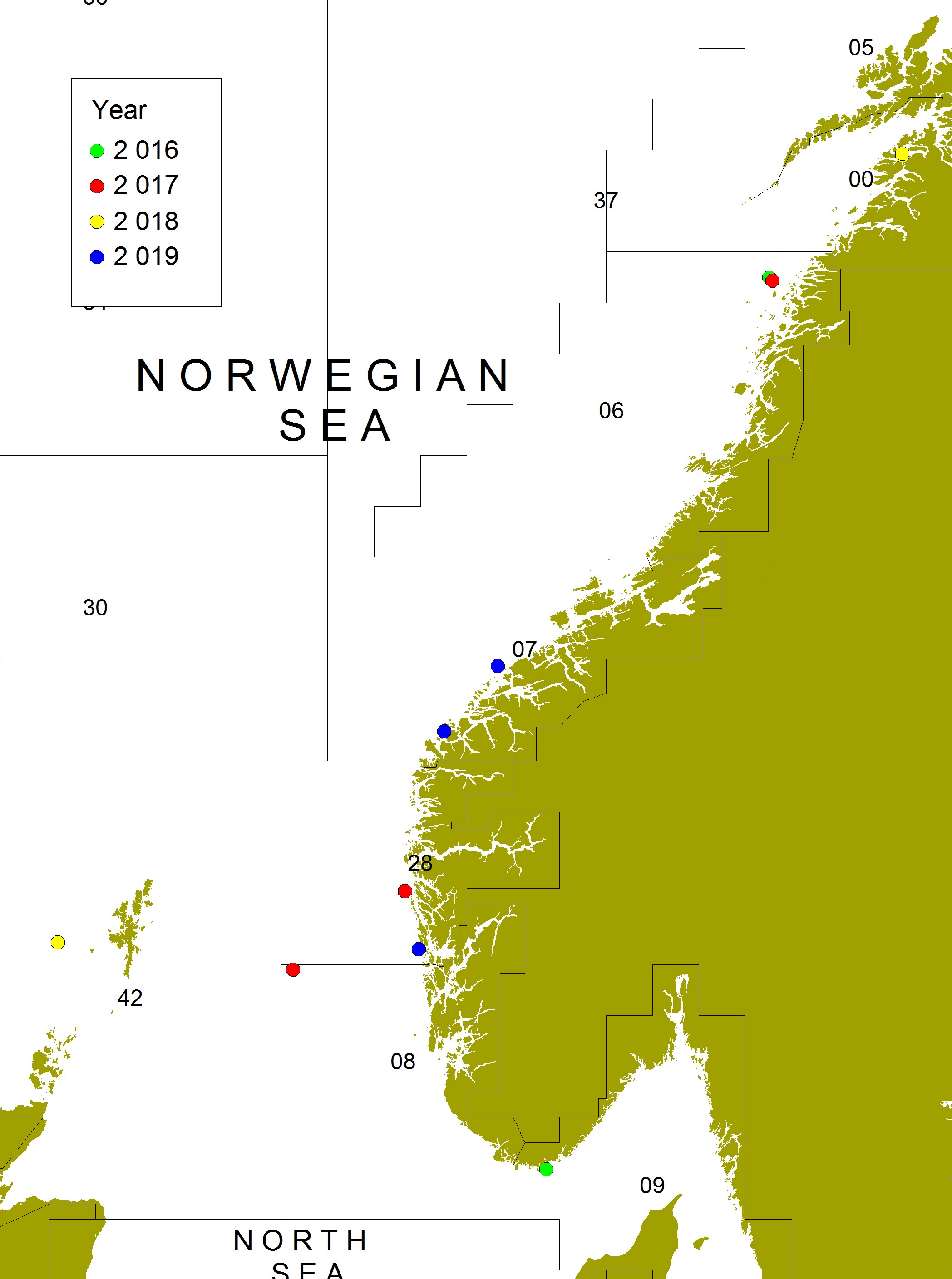 Figure 3 Positions where pollack (Pollachius pollachius, lyr) were sampled during 2016-2019. The colours indicate in which year the samples were collected. The numbered areas are the statistics areas of the Norwegian Directorate of Fisheries, applied for Norwegian fishery statistics (Fiskeridir.no).