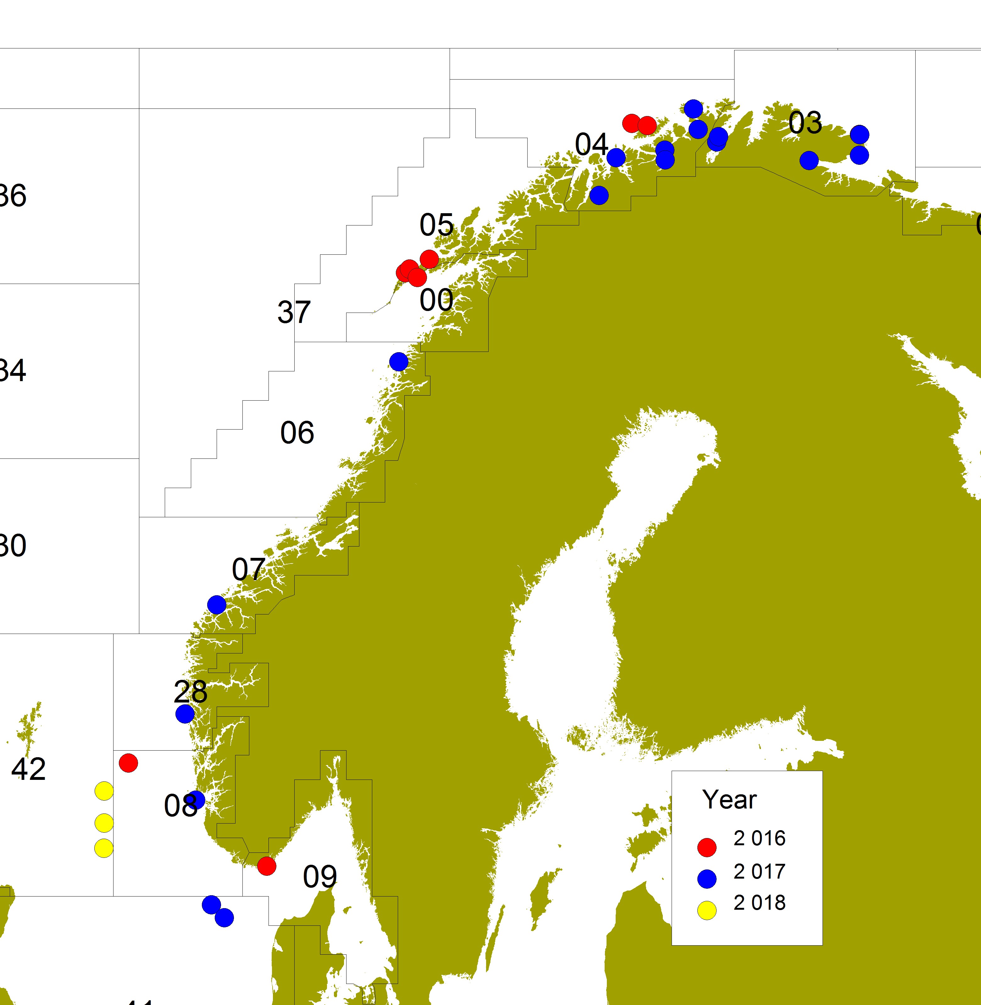 Figure 1 Positions where plaice (Pleuronectes platessa, rødspette) were sampled during 2016-2018. The colours indicate in which year the samples were collected. The numbered areas are the statistics areas of the Directorate of Fisheries, applied for Norwegian fishery statistics.