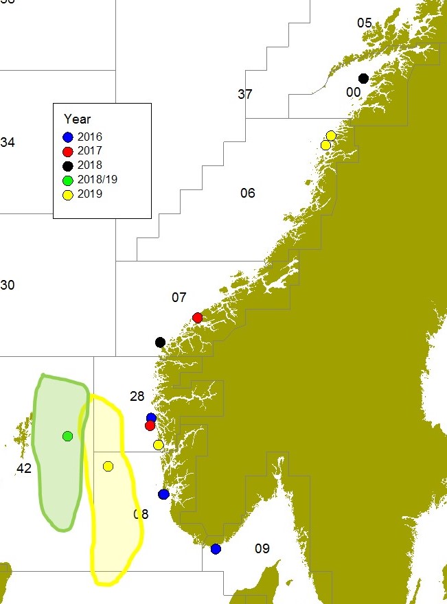 Figure 2. Positions where anglerfish (Lophius piscatorius, breiflabb) were sampled during 2016-2019. The colours indicate in which year the samples were collected. The numbered areas are the statistics areas of the Norwegian Directorate of Fisheries, applied for Norwegian fishery statistics (Fiskeridir.no). Within the large shaded areas in the North Sea, samples were taken from many different positions during scientific cruises in 2018 and 2019. The points in the middle indicate the average position for all samples within each area.