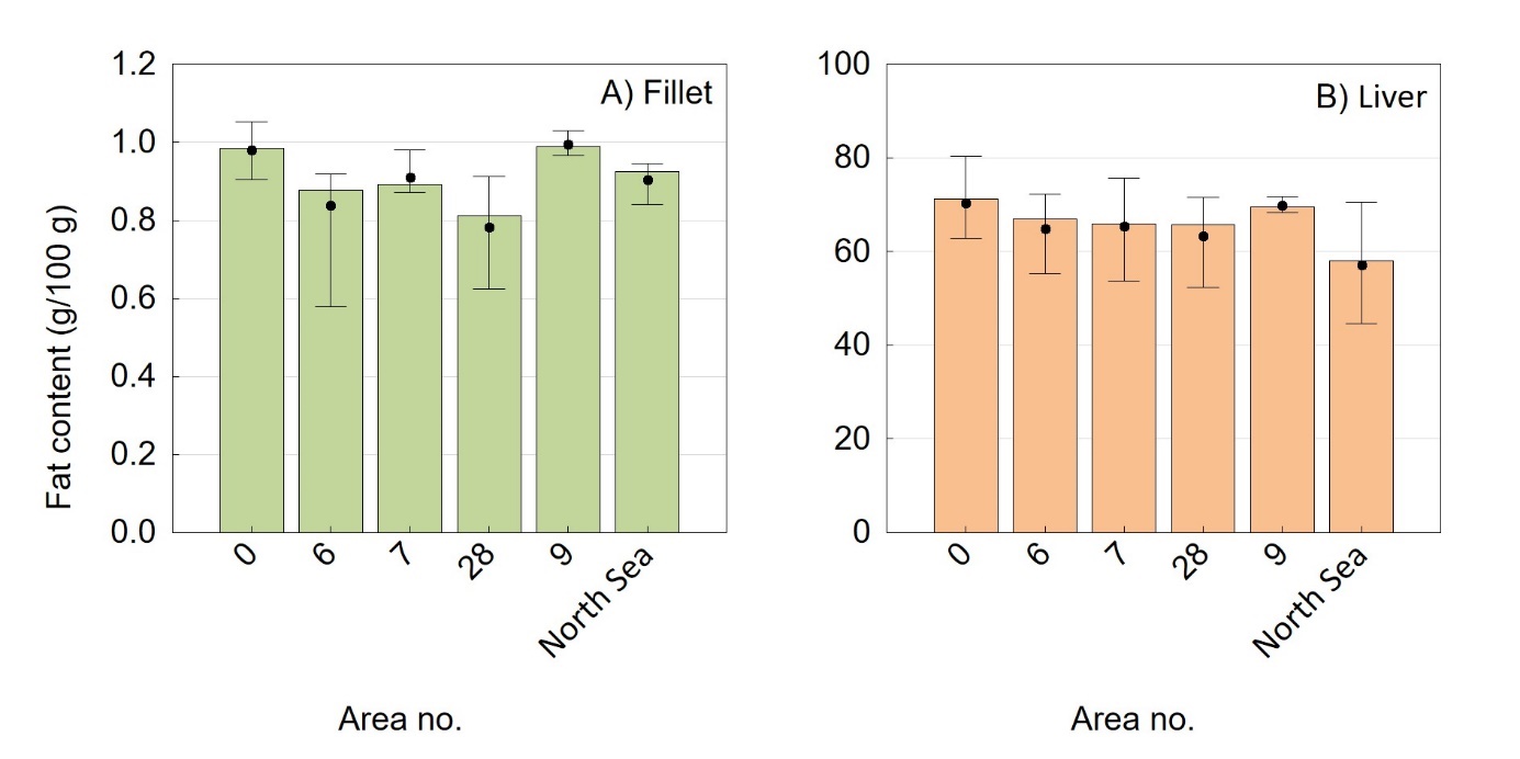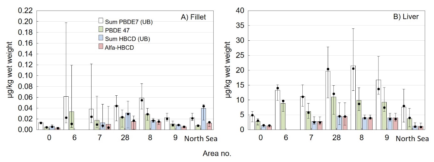 I denne undersøkelsen har vi i løpet av 2016-2019 kartlagt nivåene av miljøgifter i 448 rødspette (Pleuronectes platessa), 315 breiflabb (Lophius piscatorius) og 296 lyr (Pollachius pollachius) fisket langs kysten av Norge og i Nordsjøen. Filet fra enkeltfisk og samleprøver av lever ble analysert for metaller, og samleprøver av filet og lever ble analysert for organiske miljøgifter som dioksiner, PCB, klorerte pesticider, bromerte flammehemmere og perfluorerte alkylstoffer (PFAS). Ingen fisk hadde konsentrasjoner av noe stoff i filet over grenseverdiene som gjelder for mattrygghet i Norge og EU. For kvikksølv var nivåene høyest i breiflabb, og gjennomsnittsnivået i breiflabb var høyest langs kysten av Vestlandet, med rundt 0,4 mg/kg våtvekt. Breiflabb er imidlertid en av artene som har en særskilt høy grenseverdi for kvikksølv på 1,0 mg/kg våtvekt. Lever av breiflabb og lyr hadde høye nivåer av organiske miljøgifter, med gjennomsnittskonsentrasjoner av dioksiner og dioksinlignende PCB over grenseverdiene satt for lever av fisk. Også klorerte pesticider og bromerte flammehemmere viste forholdsvis høye nivåer i lever av de to artene. Rødspette hadde lavere nivåer av organiske miljøgifter i leveren enn de to andre artene, mens nivåene i filet var høyere. Dette skyldes trolig at rødspette lagrer en større del av fettet, og dermed også fettløselige organiske miljøgifter, i fileten. På grunn av tidligere funn advarer Mattilsynet generelt mot å spise fiskelever fra kystområdene, og for gravide, ammende og barn advares det mot å spise fiskelever uansett fangstområde. Nivåene av PFAS var lave og under kvantifiseringsgrensene for de aller fleste prøver og stoffer.