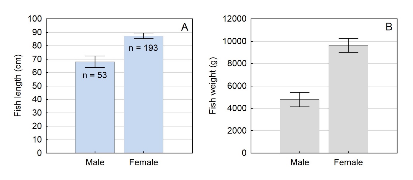 Prøvetaking av breiflabb bød på store utfordringer, og av 450 planlagte prøver fikk vi til sammen tatt 315 fisk. I utgangspunktet planla vi å ta prøver fra områder nord for Lofoten også, med 50 prøver fra område 05 og 25 fra område 04 (Nord-Troms og Vest -Finnmark, ikke i Figure 2). Her nord ble det imidlertid etter hvert rapportert at fiskerne ikke lenger fikk breiflabb, og vi fikk ingen fisk fra disse områdene. Dette tror forskerne skyldes sviktende rekruttering av breiflabb til Nord-Norge (Nedreaas, pers. medd.). Det antas at breiflabben ikke gyter i nord, og at bestanden er avhengig av at ungfisk klekket og oppvokst i sør vandrer nordover. Dette har trolig ikke skjedd på mange år, og den breiflabben som har vært i den nordligste delen av landet ser nå ut til å ha mer eller mindre dødd ut. I tillegg klarte vi ikke å få inn så mange prøver som ønsket fra områdene 00, 07 og 06, i alle disse områdene fikk vi rundt halvparten av det planlagte antallet prøver. Allikevel klarte vi til slutt å få dekket en stor del av de områdene der det fiskes breiflabb (Figure 2), selv om det mangler prøver fra et relativt stort område innenfor område 06.
