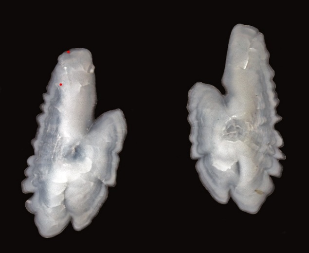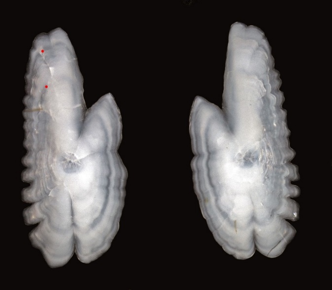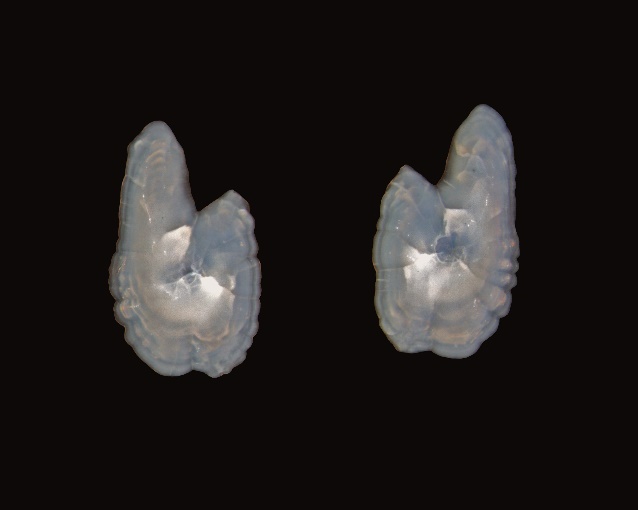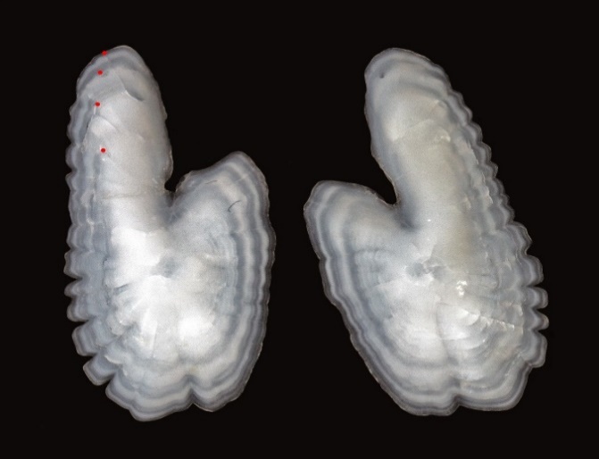 Rengjør otolittene før de legges opp. De skal ligge med konkav side opp og antirostrum (Figur 4) mot hverandre. Et lite tips er å legge to små dråper med vann i brønnene først, da legger otolittene seg fint ned. Figur 3 viser hvordan otolittene skal ligge og brettene skal merkes.