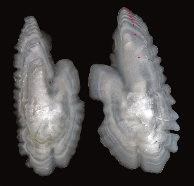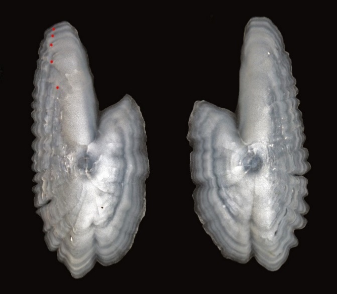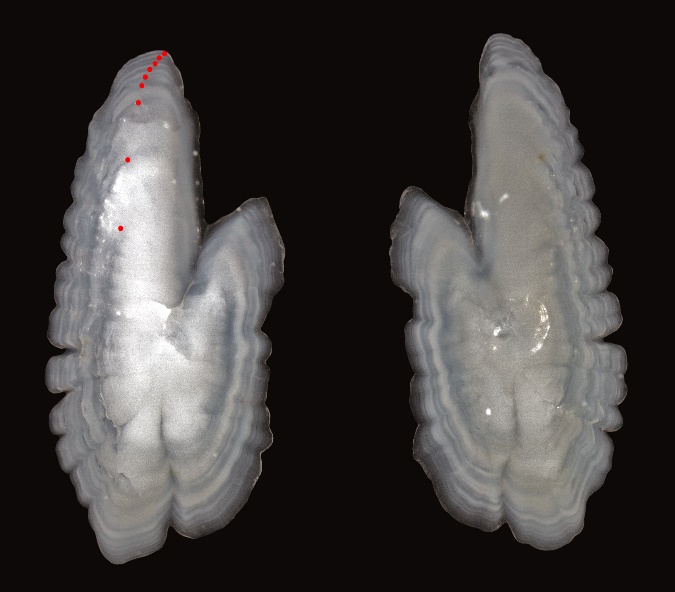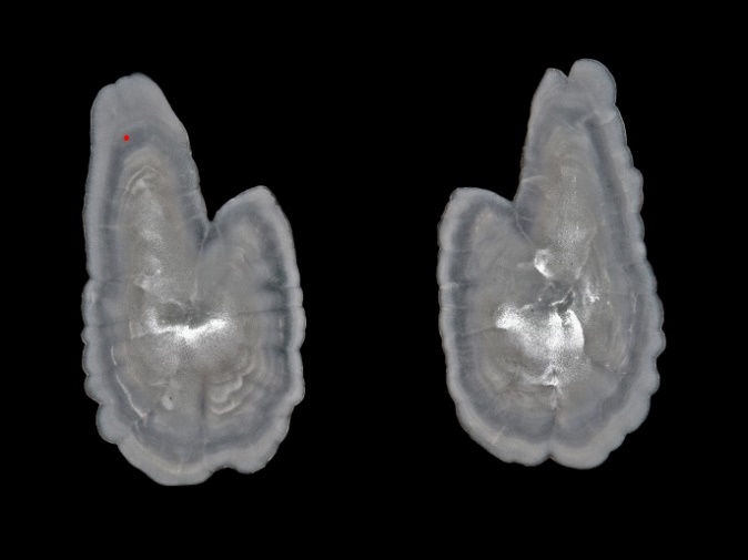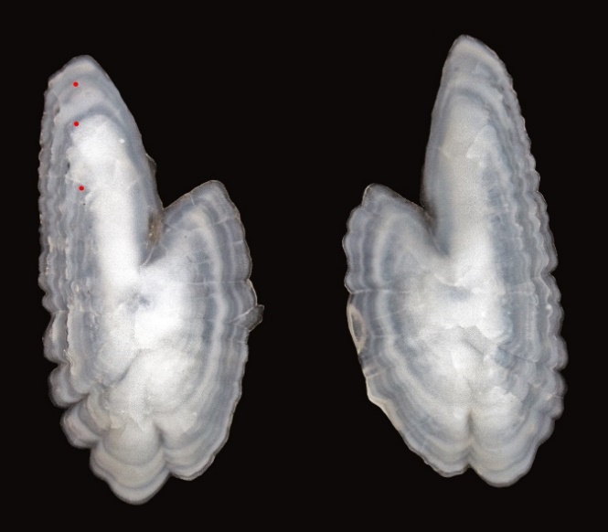 I referansesamlingen er det valgt å ikke ha otolittbildene i samme skala, men forstørre bildene så soner og annoteringer på otolittene er mest mulig synlige. Annoteringene er satt på hyalin sone.