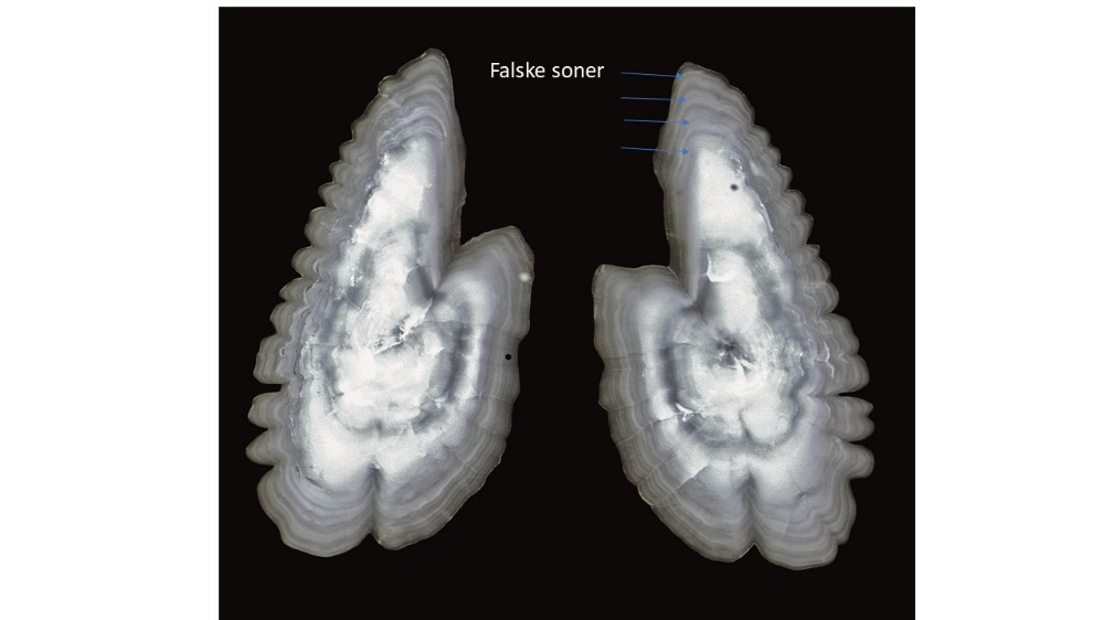 I otolitter kan det også forekomme falske soner. De kommer i tillegg til årssoner og skal ikke telles. Falske soner kan være forårsaket av sult, sykdommer, gyting eller brå endringer i miljøforhold. Et eksempel på en falsk sone i otolitten hos ung nordsjøsild er vist i Figur 5a; denne gjør at en 1-åring kan forveksles med en 2-åring. Den falske sonen blir svakere og forsvinner når nordsjøsilda blir eldre. 1-åringen på bildet er fisket i februar. Andre ganger kan falske soner se ut som dobbelringer, et eksempel på dette vises i Figur 5b. Når man får vanskelige otolitter anbefales det å diskutere disse med andre lesere på nordsjøsild siden ikke alle enkelttilfeller og utfordringer som kan dukke opp tas med i denne håndboken.