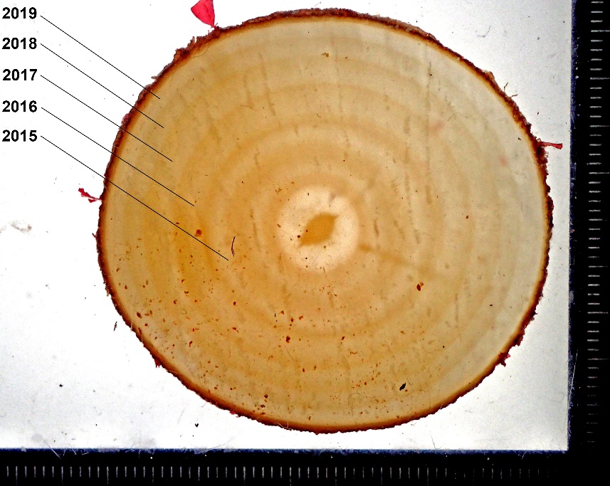 Tarestilkenes diameter ble målt i tverrsnitt tatt ca 1 cm over festeorganet, der stilkene er på sitt tykkeste. Alderen på de innsamlede tareplantene ble bestemt ved å telle vekstsoner i tverrsnittene og samtlige tverrsnitt ble avfotografert for senere målinger av vekstsonearealene og rekonstruksjon av plantenes veksthistorikk. Størrelsen (arealet) av hver enkelt vekstsone vil gi informasjon om tareplantenes vekst i et gitt år, der den ytre ringen representerer veksten i 2019, den nest ytterste ringen veksten i 2018, etc, etc (Fig. 7). Arealet på en vekstsone (a) ble estimert ved å måle bredden fra tverrsnittets sentrum til indre (i) og ytre (y) vektsonegrense langs to akser med ca 90 graders vinkel og beregnet utifra formelen a = π y 2 – π i 2 .