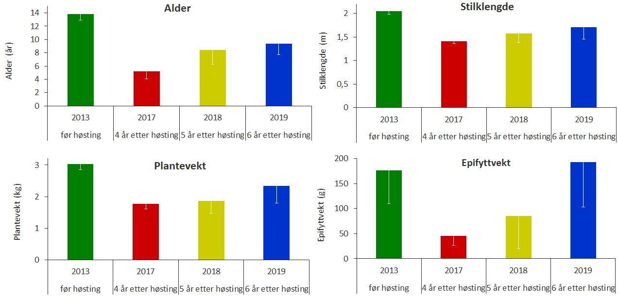 Figur 13. Alder, stilklengde, plantevekt og epifyttvekt hos tareplanter samlet inn før høsting i 2013 (grønne søyler), 2017 (røde søyler), 2018 (gule søyler) og 2019 (blå søyler) i bølgeeksponert sektor på PF3 i Nordland. Nedre grense for 95 % konfidensintervall er tegnet inn.