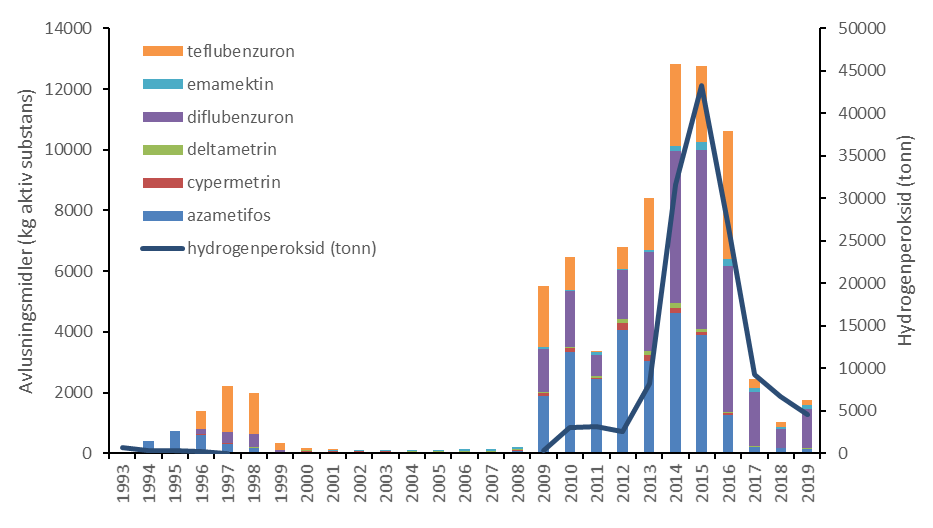 Bruken av kjemiske avlusingsmidler økte kraftig fra 2009 frem til 2014-2015 (Figur 2.1, Tabell 2.1). Forbruket gikk litt ned i 2016, og deretter drastisk ned i 2017. I både 2018 og 2019 lå forbruket på et lavt nivå. Nedgangen skyldes først og fremst at ikke-medikamentelle avlusingsmetoder har blitt tatt i bruk (Grefsrud mfl. 2018). Avlusingsmidler kan gis i fiskefôr (diflubenzuron, teflubenzuron, emamektin benzoat) eller som bademidler (hydrogenperoksid (H2O2), azametifos, deltametrin, cypermetrin). Hvor raskt stoffene spres, fortynnes og brytes ned (halveringstid) varierer mellom de forskjellige avlusingsmidlene, og avhenger av vanntemperatur, vind, strøm og sjikting av vannsøylen.