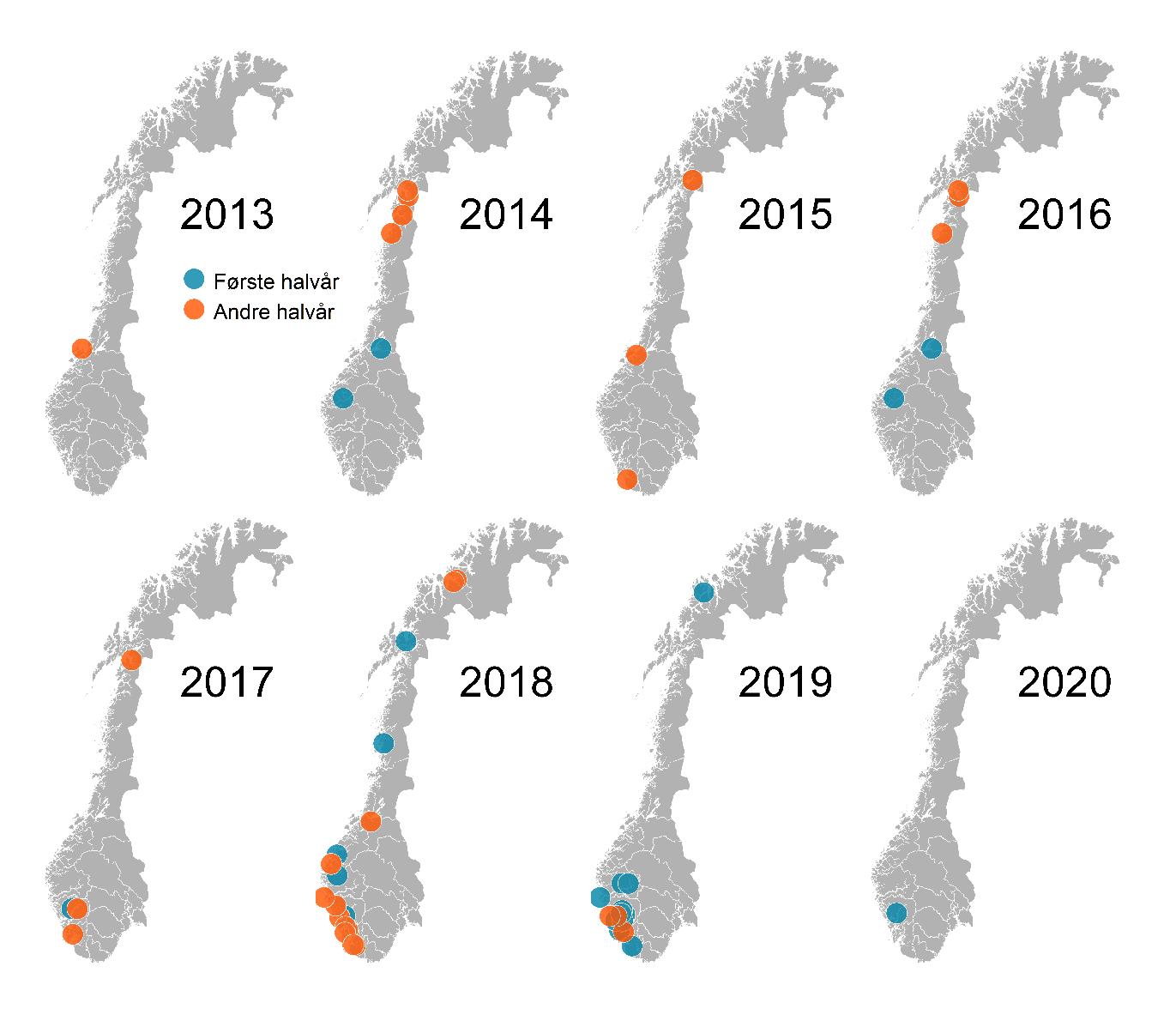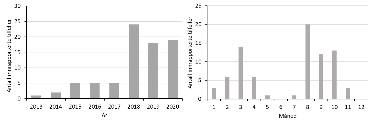 In 2014, the Institute of Marine Research (IMR) started to register incidents of stranded krill, based on observations from the public. The number of incidents were few from 2014 to 2017, but increased sharply in 2018 and had since remained at this level. It is hard to know if more krill have stranded the last three years, or if more people now report observations. The number of incidents increased just when the use of chemical delousing agents in Norway decreased sharply, while the number of reported mass strandings was relatively low when the use of chemical delousing agents was at its highest. The frequency of mass strandings can also be related to the amount of krill in the sea. March, August, September and October are the months when most mass strandings took place. Most of the reports come from the Rogaland and Hordaland counties, while there have not been any reports from Finnmark county or the Skagerrak coast.