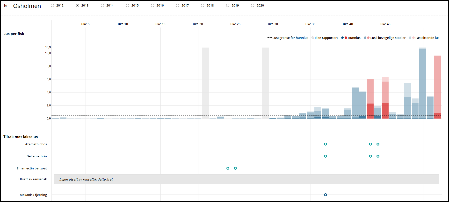 For krilltilfellene fra årene 2014-2018 ble det kartlagt eventuell kjemisk avlusing på oppdrettsanlegg innen en avstand av 20 km fra funnstedet i tiden før funnet av krill, samt eventuell brønnbåtaktivitet i området i samme tidsrom. Disse tilfellene ble gjennomgått først. Da krilltilfellene fra 2013, 2019 og 2020 (samt nye enkelttilfeller fra 2014-2018) ble gjennomgått, ble det bestemt å begrense de detaljerte undersøkelsene til anlegg innen en avstand av 10 km fra funnstedet da driftssimuleringer viser at bademidler fortynnes raskt i tid og rom etter et utslipp (Parsons mfl. 2020, Refseth mfl. 2019). I vurderingen av en eventuell sammenheng mellom kjemisk avlusing og død krill (se under) har vi bare sett på avlusing ved anlegg opptil 10 km unna, da modellering av utslipp av deltametrin viste at LC50 konsentrasjoner (for hummerlarver) i gjennomsnitt (± standardavviket) kunne detekteres opptil 10,6 (± 5,6) km fra utslippspunktet. Påvirkningsområdet av et utslipp av bademidler avhenger imidlertid av strøm- og vindforhold, og i noen tilfeller kan rester av behandlingsvannet (deltametrin) drive opptil 20 km før konsentrasjonen faller under LC50 (Parsons mfl. 2020).