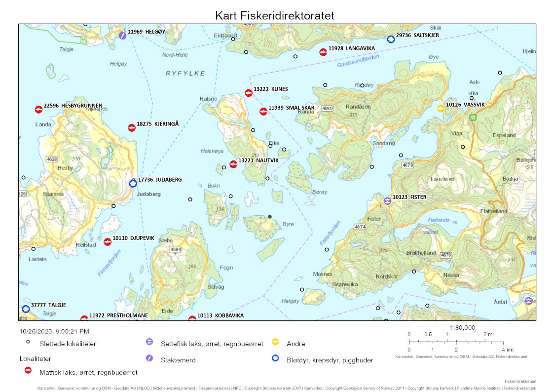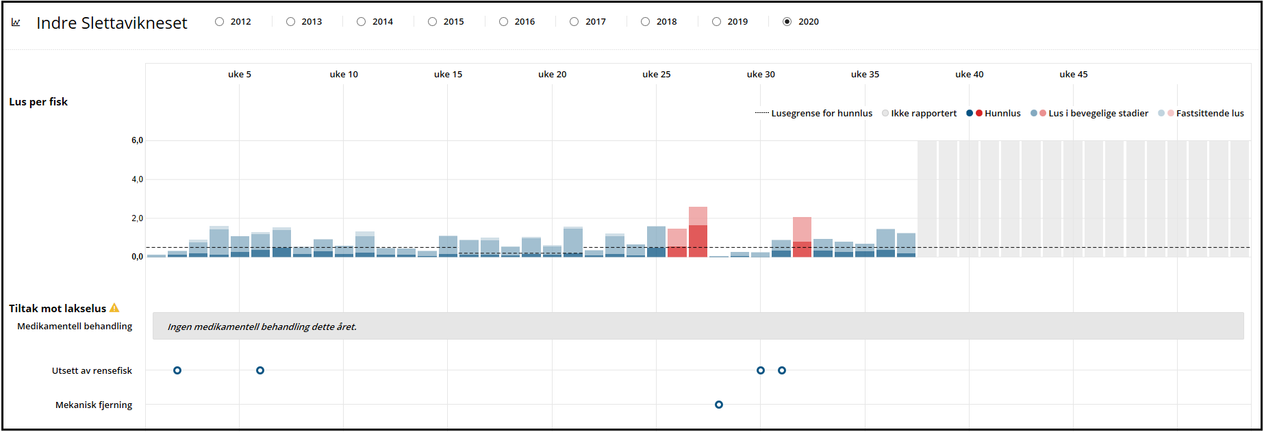 En del av anleggene avluser vha. brønnbåt. BarentsWatch oppgir ikke om en avlusing har skjedd i merdene eller i brønnbåt. Etter avlusing i merdene vil avlusingsvannet slippes ut under anlegget. Ved avlusing i brønnbåt har vi ikke informasjon om hvor avlusingsvannet slippes ut, men Forskrift om transport av akvakulturdyr (§ 22a, https://lovdata.no/dokument/SF/forskrift/2008-06-17-820) sier at det ikke kan tømmes til sjø nærmere enn 500 meter fra rekefelt eller gytefelt (som vist i Fiskeridirektoratets nettbaserte kartverktøy). Informasjon i BarentsWatch om avlusing ved et anlegg behøver dermed ikke nødvendigvis bety at avlusingsvann er sluppet ut ved anlegget.