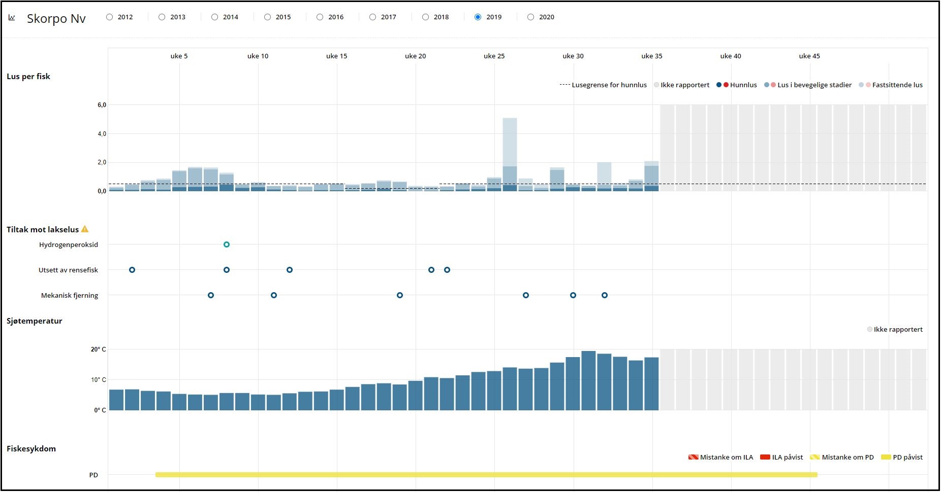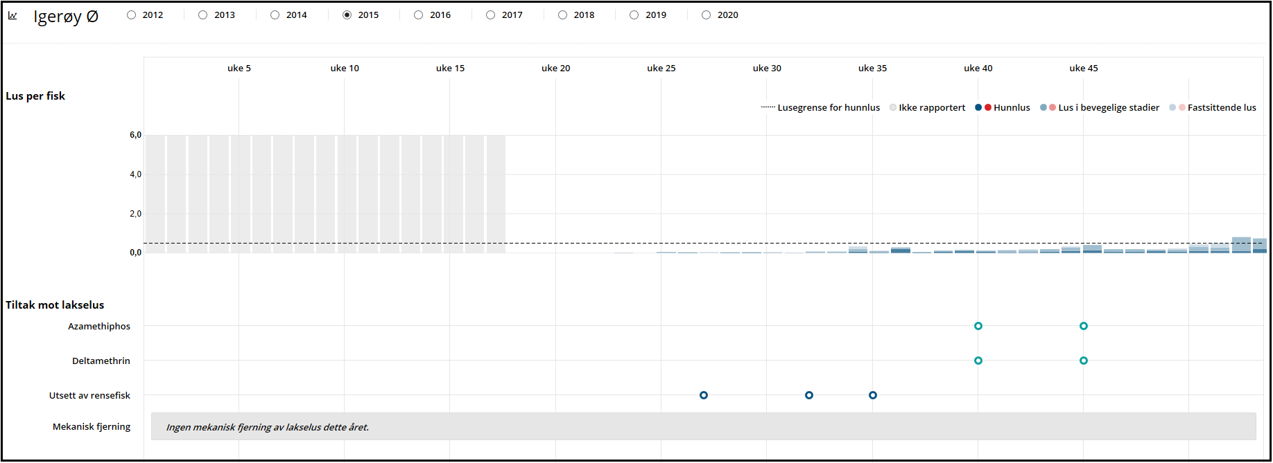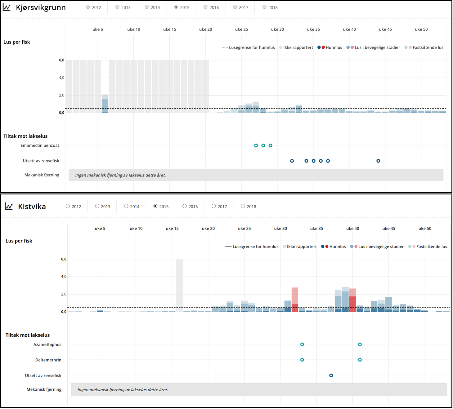 Fra 2014 til 2018 var det flest forskrivninger av avlusingsmidler i produksjonsområdene 3 og 4 (Karmøy til Stad) (Grefsrud mfl. 2019). I 2014 var det i underkant av 1000 forskrivninger i produksjonsområde 4 og rundt 790 i produksjonsområde 3, i 2018 var antallet redusert til rundt 80 i hvert av de to produksjonsområdene. I produksjonsområde 6 (Nordmøre og Sør-Trøndelag) var det rundt 490 forskrivninger i 2015, mens det var redusert til 21 i 2018.