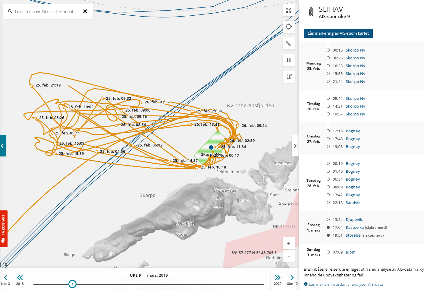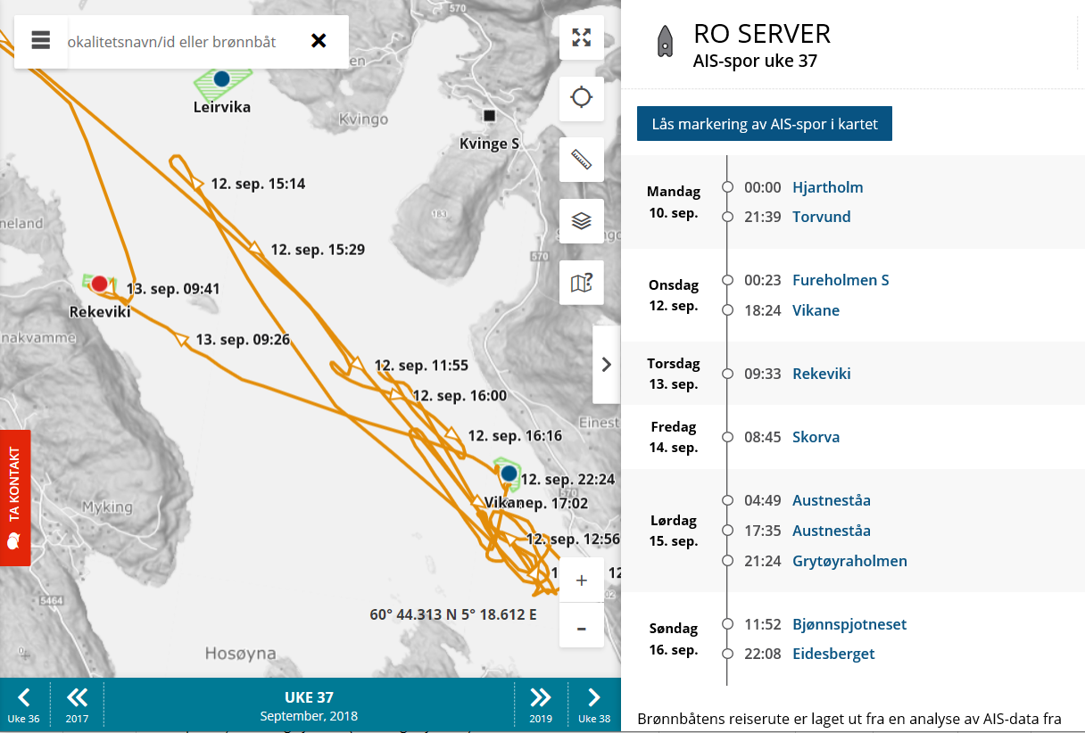 AIS-sporing av brønnbåter og dato for anløp ved anlegg er tilgjengelig i BarentsWatch. Settefiskanlegg og slaktemerder er oppgitt. Vi antok derfor at en brønnbåt som anløp et oppdrettsanlegg rett etter anløp ved et settefiskanlegg, kom med settefisk til anlegget, mens en brønnbåt som anløp en slaktemerd rett etter anløp ved et anlegg, hadde med fisk som skulle slaktes. Brønnbåter er ikke pålagt å opplyse om hvor avlusingsvann slippes ut. Ifølge Forskrift om transport av akvakulturdyr (§ 22a) skal vannet tømmes ut mens fartøyet er i fart når tømming av badebehandlingsvann skjer andre steder enn ved akvakulturanlegget. Vi antok derfor at brønnbåter som går i sakte fart ned mot 0 knop (AIS-sporing), slipper ut avlusingsvann.