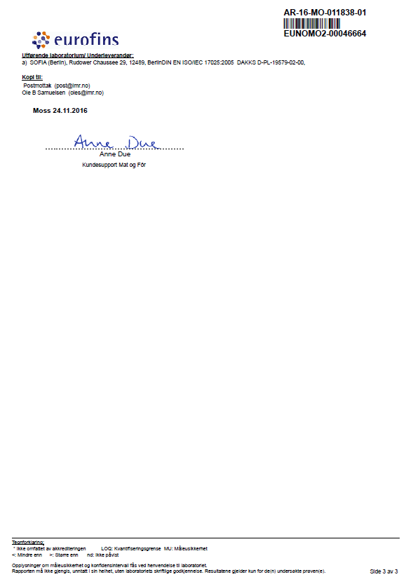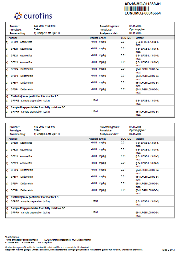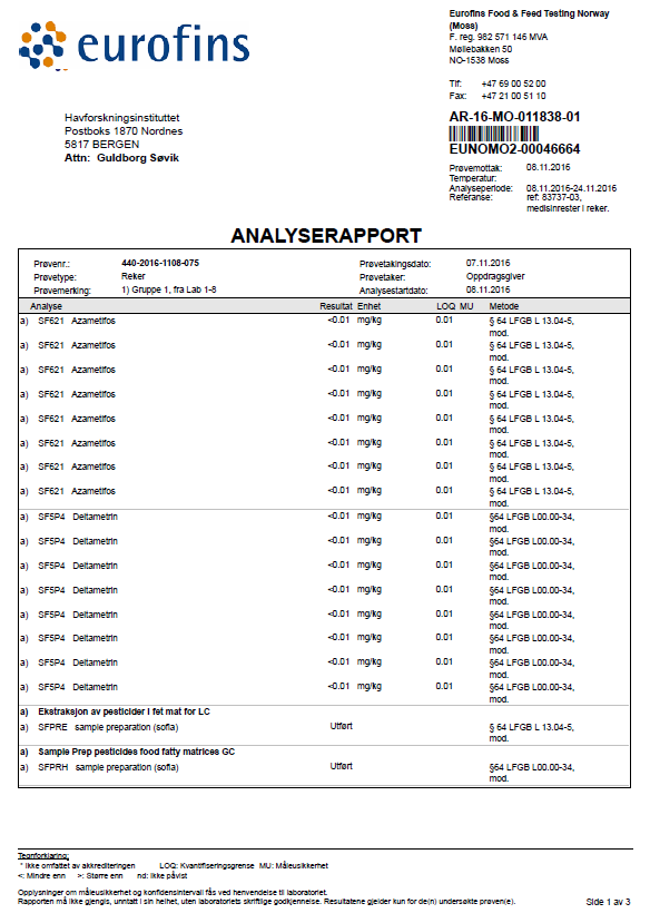 Under analysene i 2015 var LOQ (Limit of Quantitation) 10 ng/g for begge stoffene. På forespørsel i 2020 informerte Eurofins om at for deltametrin ligger den laveste LOQ fortsatt på 10 µg/kg, mens for azametifos er den nå 5 µg/kg. Tilbakemeldinger fra andre kommersielle laboratorier er at de heller ikke har lavere LOQ.