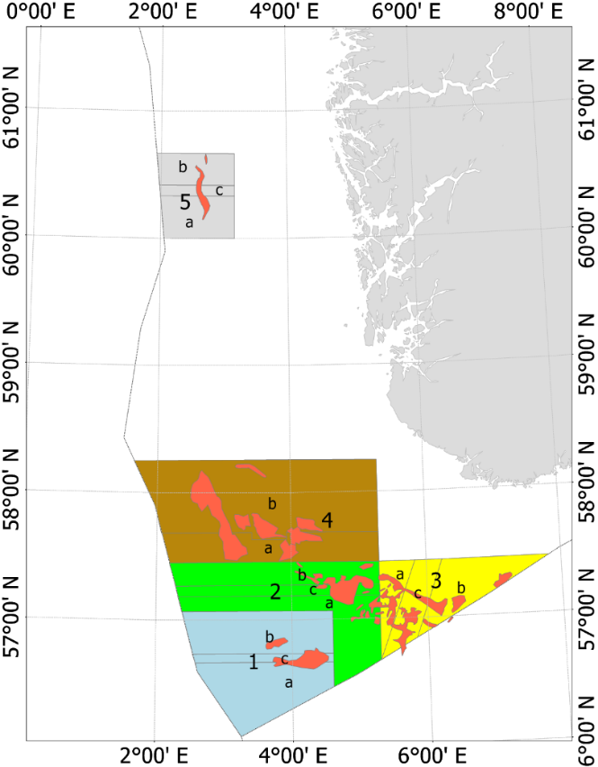 Figur 5 . Forvaltningsområdene i norsk sone (Områdeinndelingen er gyldig fra 2020). De røde feltene inni forvaltningsområdene viser de viktigste tobisfeltene.