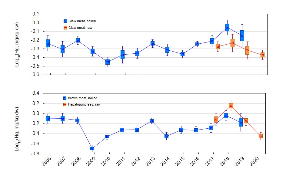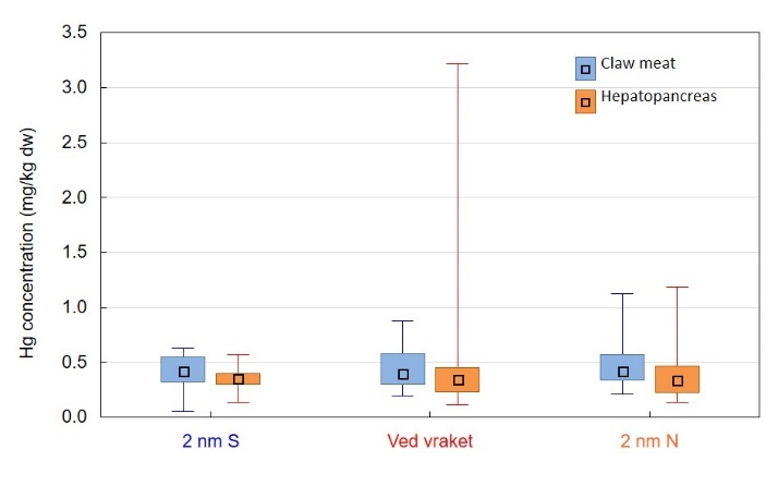 Gjennomsnittskonsentrasjonen i klokjøtt av krabber prøvetatt ved vraket, på 0,076 mg/kg våtvekt, var lavere enn de tre foregående årene (snitt 0,11 – 0,16 mg/kg våtvekt), da krabbene også ble analysert rå (vedlegg tabell A2). Også i hepatopankreas var gjennomsnittskonsentrasjonen av kvikksølv lavere i 2020, med et snitt på 0,13 mg/kg, enn de tre foregående årene (snitt 0,21 til 0,53 mg/kg våtvekt).