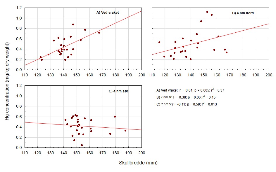 Figur A1. Sammenheng mellom kvikksølvkonsentrasjon (mg/kg tørrvekt, dw) i klokjøtt og skallbredde (mm) for krabber prøvetatt i 2020 A) ved vraket av U-864, B) 4 nautiske mil (nm) nord og C) 4 nm sør for vraket. Resultat av Pearson’s lineær korrelasjon er gitt for hver lokalitet.