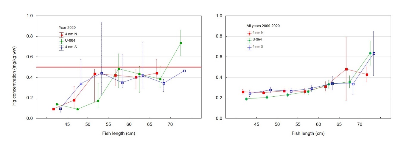 Figure 3. Concentration of mercury (mg/kg ww; mean and confidence interval) in fillet of tusk (Brosme brosme) at different length intervals (<45, 45-50, 50-55, 55-60, 60-65, 65-70 and >70 cm), caught at three different sites; at the wreck of U-864, four nautical miles south (4 nm S) and four nautical miles north (4 nm N) of U-864. Left: Year 2020 only, median, minimum and maximum values shown. Right: All years 2009-2020, means ± 95% confidence intervals are given.