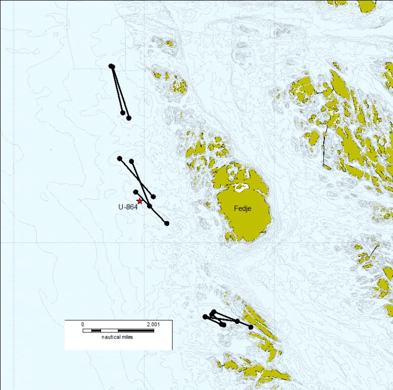 Vraket av U-864 ligger i to deler på rundt 150 meters dyp om lag tre kilometer vest for øya Fedje, ved 60°46' N, 4°37' Ø. Prøvetakingen av brosme og krabbe ble gjennomført i perioden 1.-6. mai 2020 av kystfisker Helge Torsvik med hans 43 fots fiskebåt M/K Vikingfjord (H-1-A). Prøvene ble tatt med dypvannteiner i lenker satt i området ved vraket, mellom 4 nautiske mil sørøst for vraket (4 nm S) og mellom 2,3 og 4 nautiske mil nordvest for vraket (4 nm N) (Figur 1). I kartet er posisjonene for hver teinelenke tegnet inn.