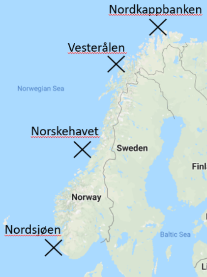 Dette er 4 havområder med ulike egenskaper. Nordkappbanken og Vesterålen ble valgt fordi dette er lokasjonene for de to viktigste forsøkene som ligger til grunn for seismikkrådgivningen. Områdene lenger sør i Norskehavet og Nordsjøen ble valgt fordi de representerer havområder med mye seismikk-aktivitet og fordi de har annen bunn og dybde som kan demonstrere eventuell forskjell i lydpropagasjon.