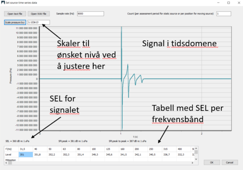 Ray tracing er den eneste regnemodellen som gjør beregningene i tidsdomenet. For denne regnemodellen er det mulig å legge inn kildesignalet direkte som en signal-snutt i en wav eller csv-fil. I forbindelse med at vi testet denne modellen fikk vi noen eksempel-filer på kildesignal av Jurgen Wissenberger i Eqinor, sammen med en fremgangsmåte for bruk i dBSea for ray tracing. Vi justerte kildenivået ved å multiplisere hele signalet med en konstant faktor slik at vi fikk ønsket SEL for 1 sekund.
