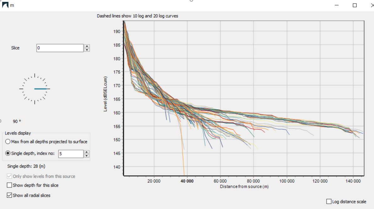 Vår interesse var hovedsakelig hvordan lydnivået endret seg med avstand, spesielt rundt 5 og 20 nmi fra kilden som er grensene vi bruker i seismikkrådgivningen. For å finne svaret på dette brukte vi plottefunksjonen «Radial», som gir lydnivået (SEL) som funksjon av anstand for ulike retninger. Et eksempel er vist i Figur 4. Der er det 360 kurver, en for hver grad i alle retninger. Variasjonen mellom kurvene gjenspeiler variasjon i lydnivå ved ulike retninger. Her er lydnivået ved 28 m dyp valgt ut. Dette er for å sammenligne med resultater i (Handegard, Tronstad og Hovem 2013) som var vist ved 30 m dyp. Grunnen til at kurvene har ulik lengde er dimensjonene på modellen, og nærhet til land. For Nordkappbanken var det mye mindre variasjon med retning siden havdypet var mer homogent. Resultat ved 5,10 og 20 nmi ble plukket ut fra Radial-plottet og vist i Tabell A2.3.