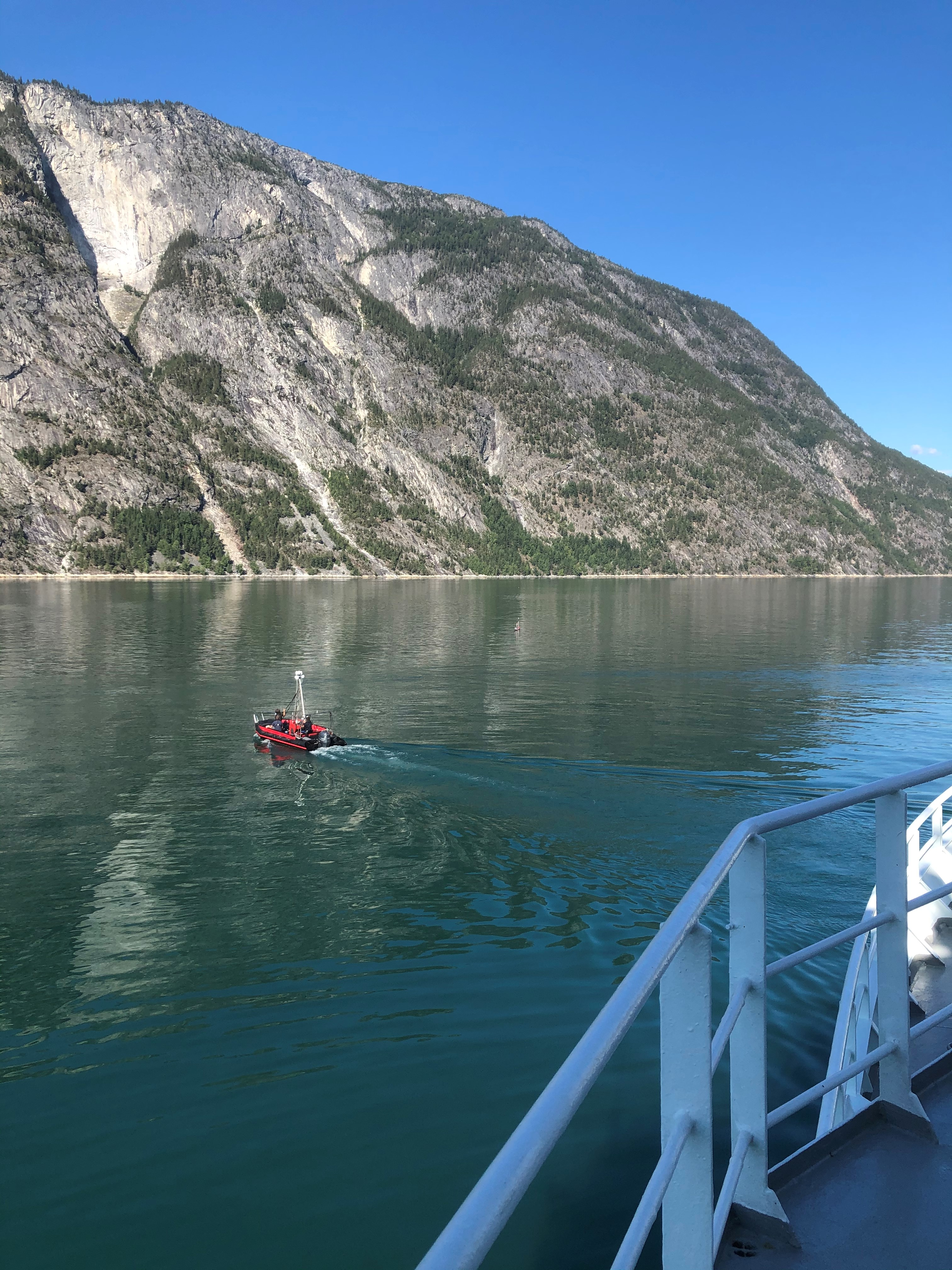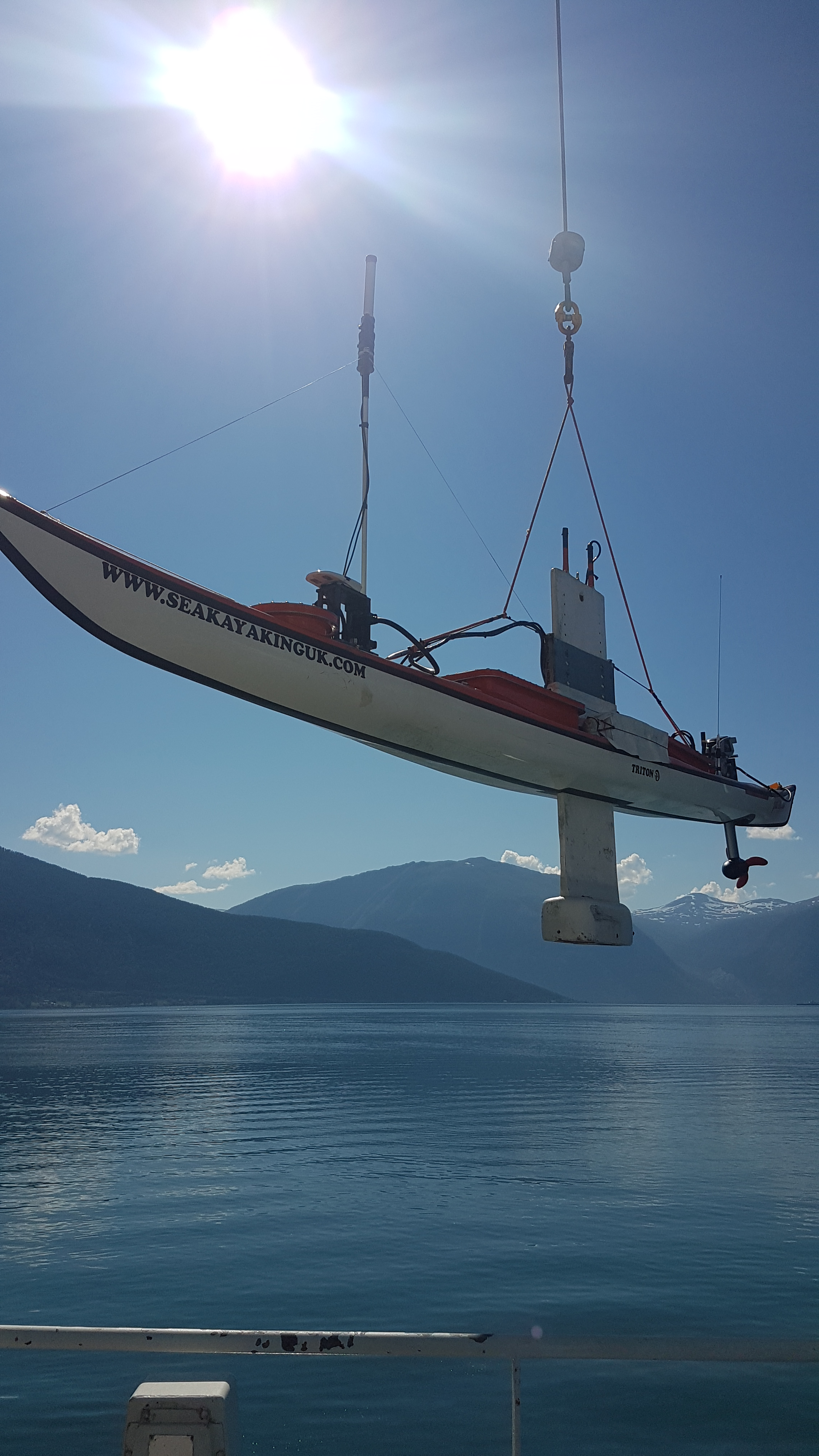 Figure 3. The kayak drone running one of the planned transects in Årdalsfjorden, Sognefjord. (photo: Espen Johnsen).