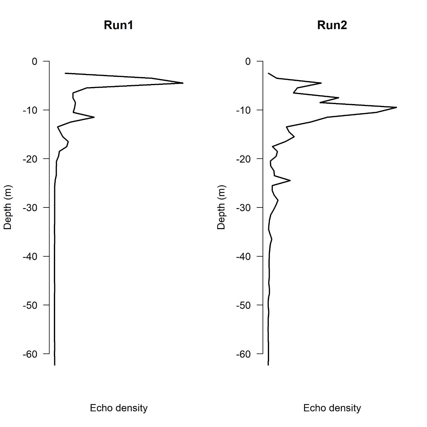 In run1, which was carried out from dusk till almost midnight ( 15/8 UTC 18:20 – 21:31 ), 63% of the fish density was observed closer to the surface than 8 meters, and 89% of the fish was distributed shallower than 15 m (Figure 10). At daytime, (run2, 16/8 UTC 11:34 – 15:52 ) the fish was distributed deeper, and 24% of the fish was distributed closer to the surface than 8 m, and 78% was distributed shallower than 15 m (Figure 10).