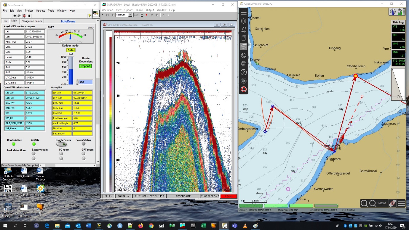 Figure 5. Screen dump of the kayak drone PC. To the left is the EchoDrone.exe control software. In the middle EK60 software showing a school of sprat in the current position close to the shore. To the right is the OpenCPN chart program. The route is indicated by consecutive red arrows. Next waypoint is indicated by a red circle with yellow fill. The drone is shown as a red ship and the actual sailed track of the drone is shown as a curved line.