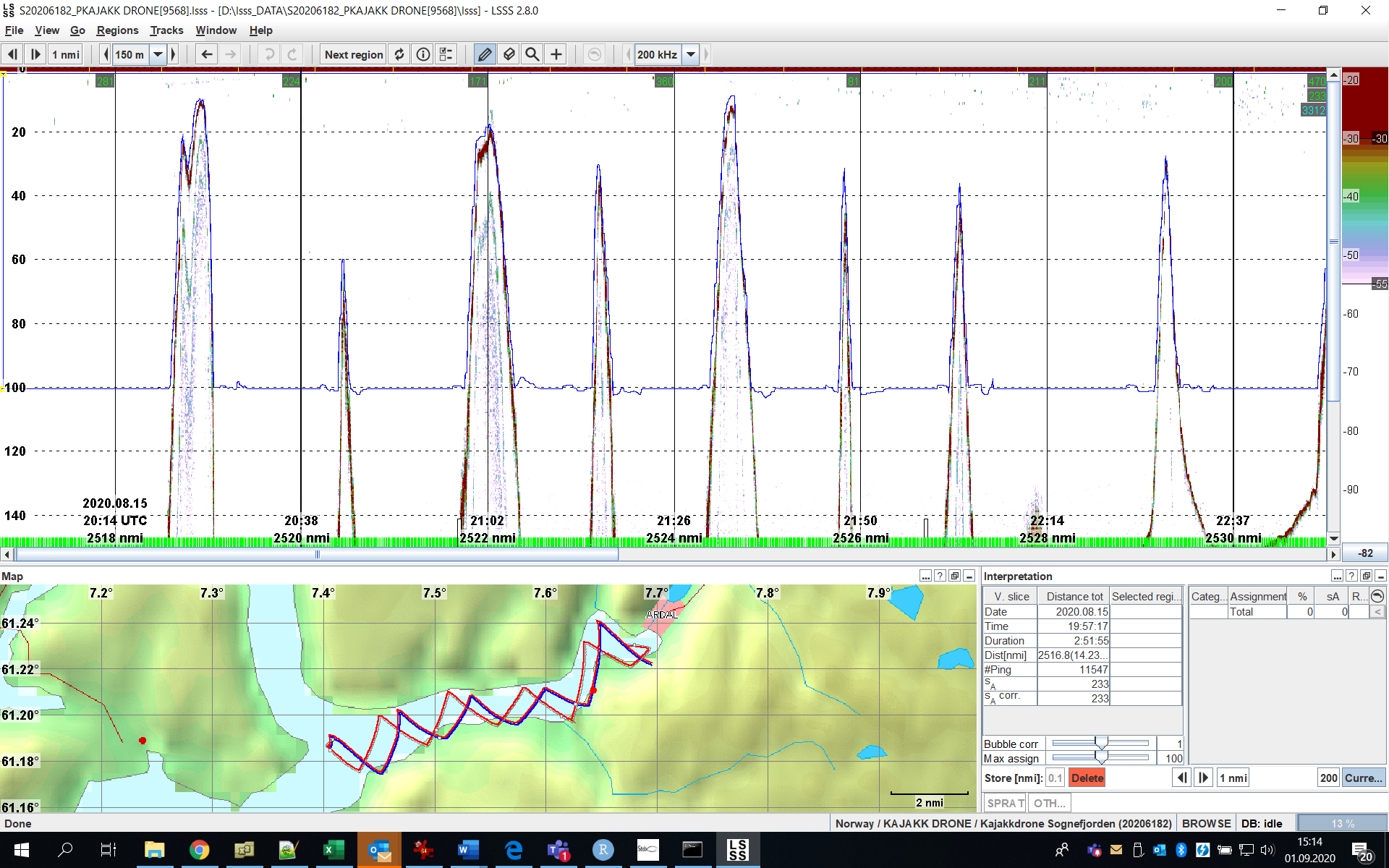Figure 6. Screen dump of the LSSS software. Top picture: Echogram of the second run. Bottom left: Map of both runs (run1 is depicted as a red line and run2 is depicted as blue line). Bottom right: Acoustic categorizing window.