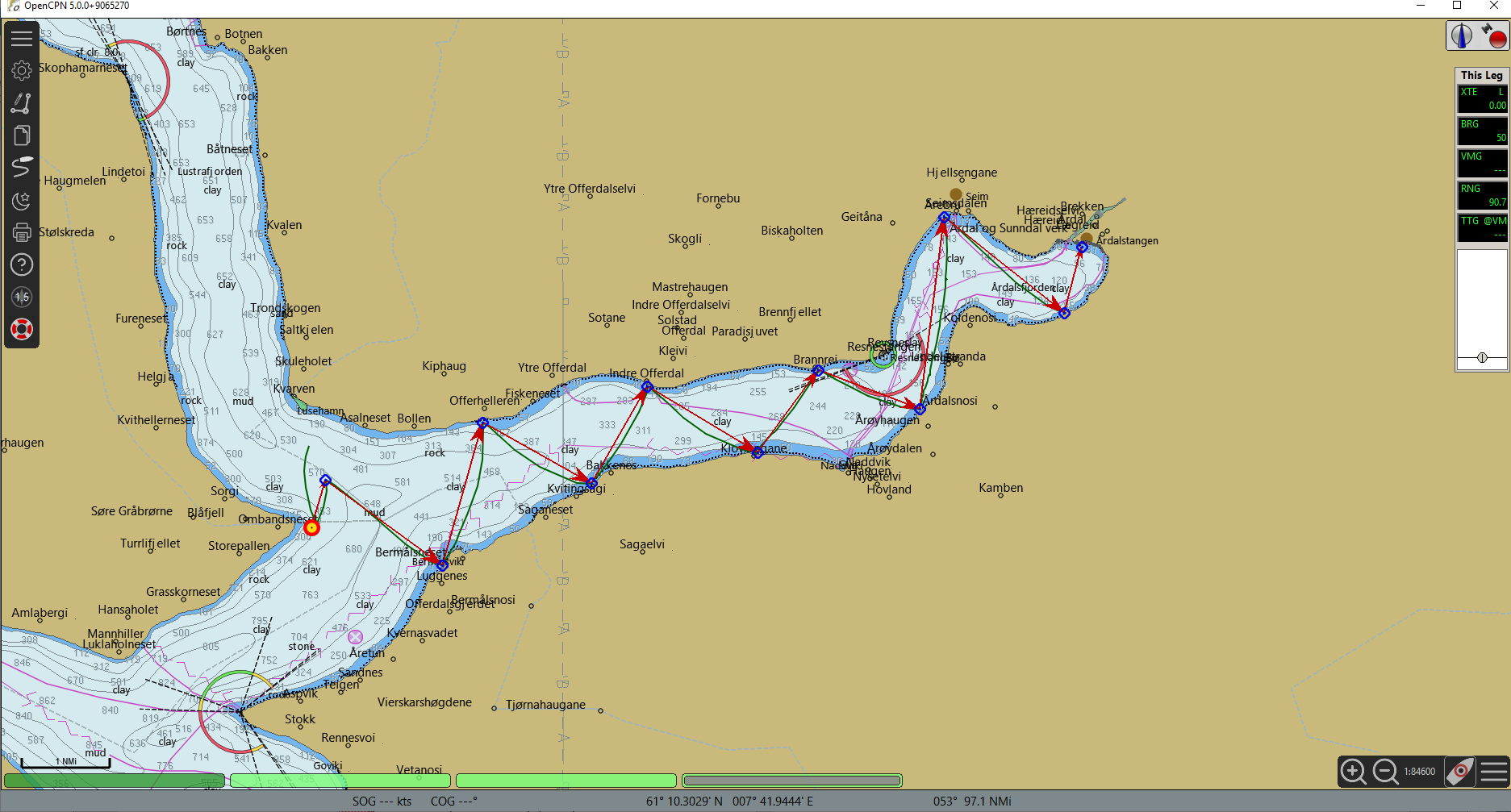 In OpenCPN, a closed route (GPX format) was made interactively for Årdalsfjorden, with the outer boundaries 30 meter from the shore.