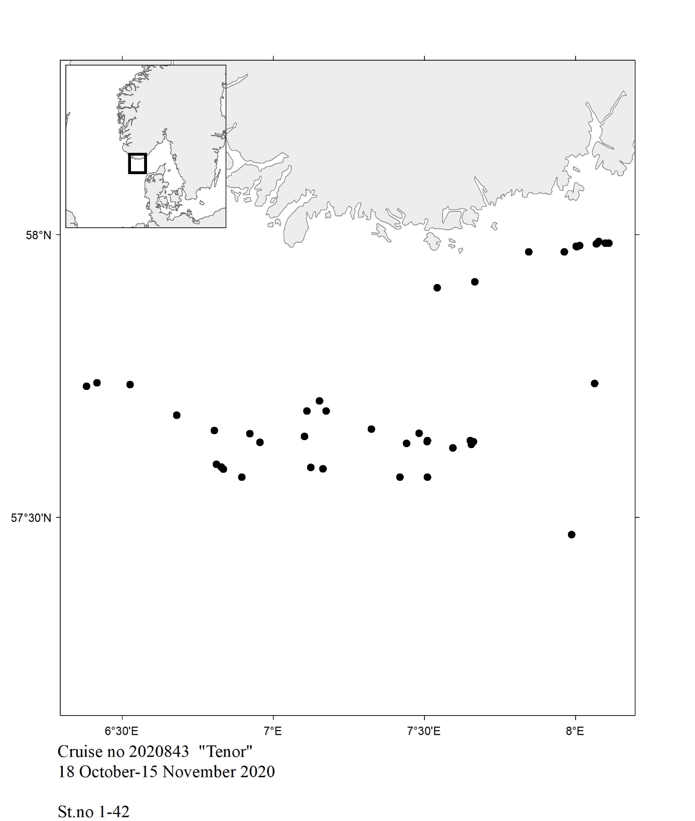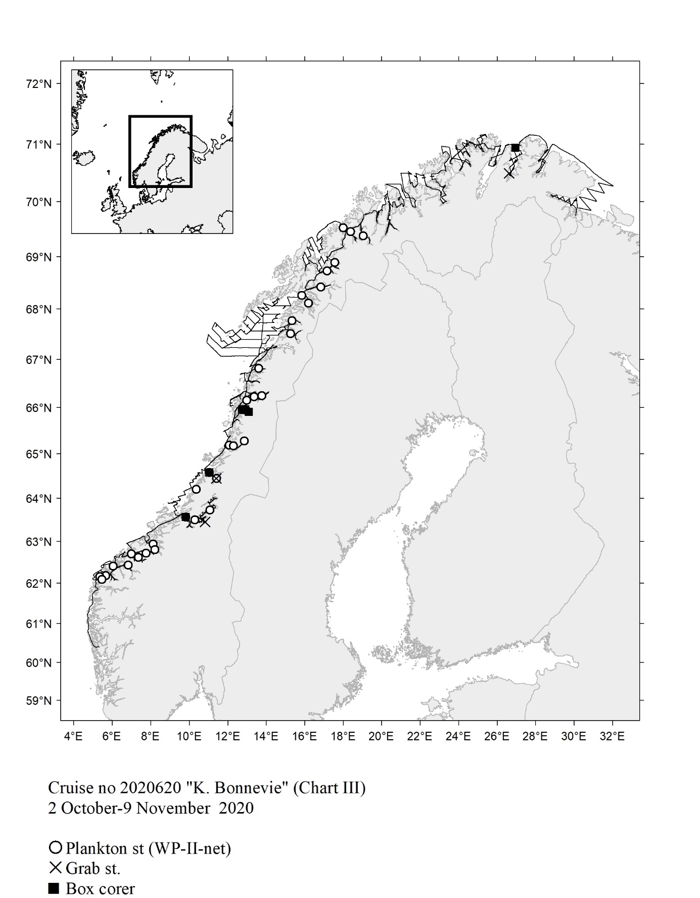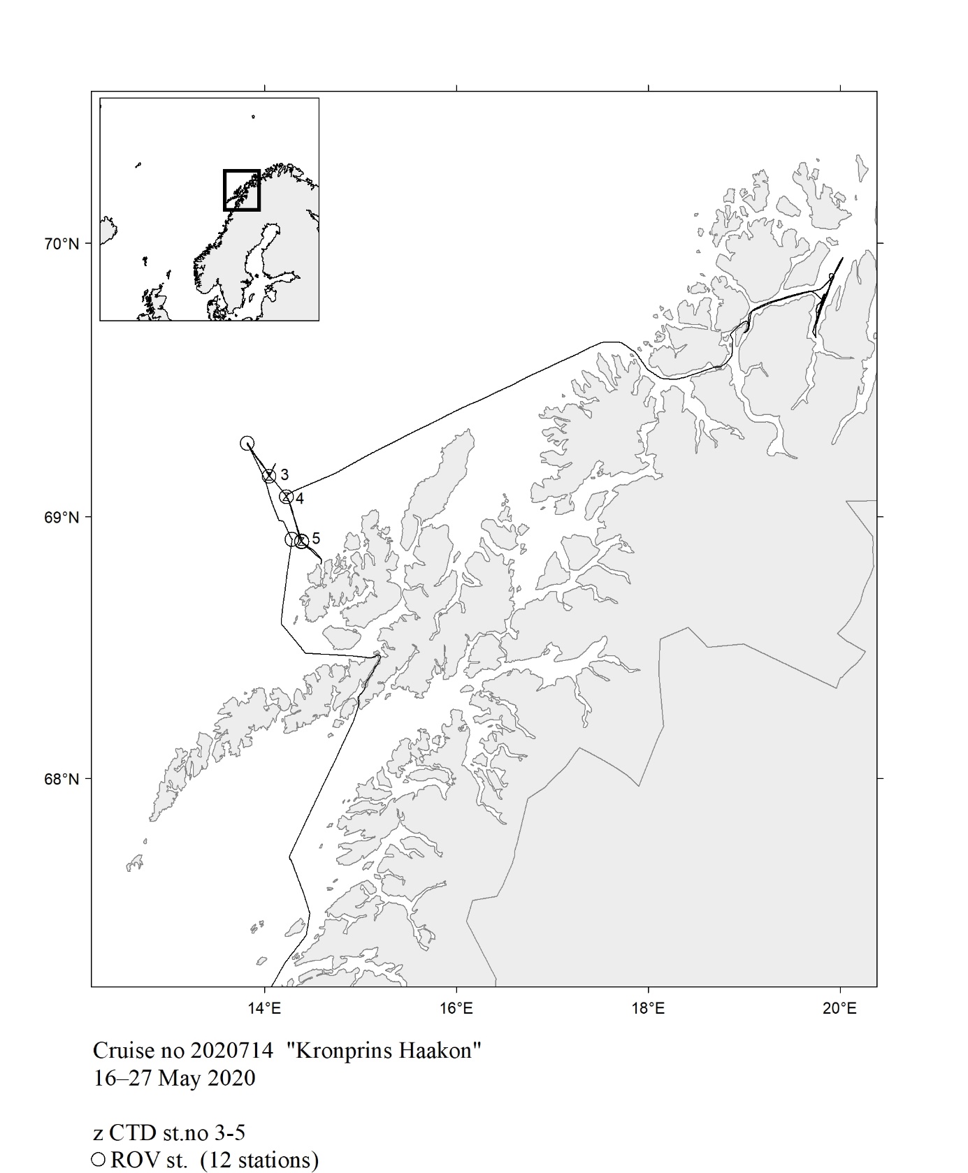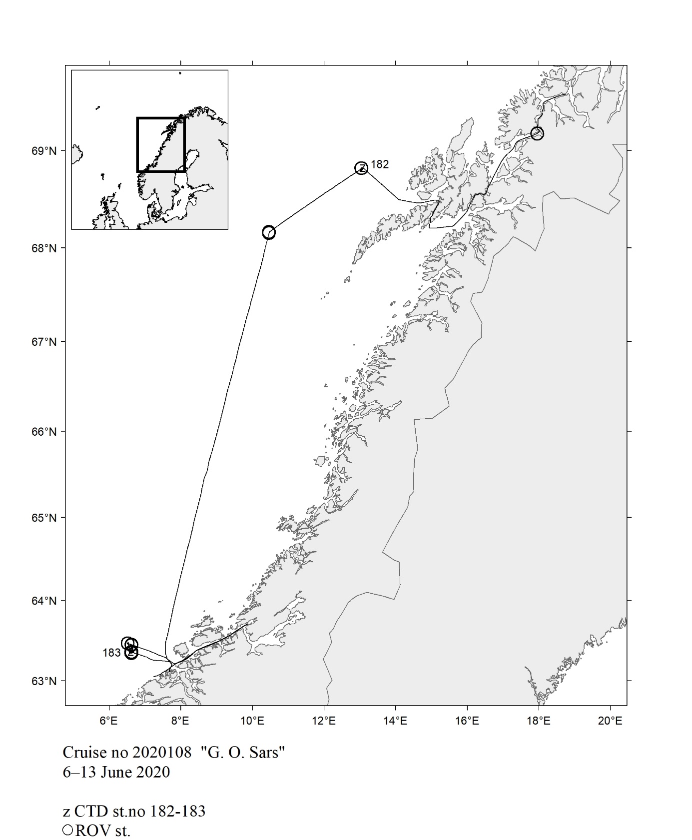 The report gives an overview of cruises in 2020, by the Institute of Marine Research, University of Bergen and Tromsø and Norwegian Polar Institute, Tromsø on board our research vessels and many of the hired commercial vessels. Each cruise is described by a short description and a track chart mainly showing CTD, plankton and trawl stations. The coverage of the oceanographic sections is listed in a table. Another table shows the number of observations per month for the fixed stations. Meta data about the cruises are reported to the International Council for the Exploration of the Sea (ICES) using the form “Cruise Summary Report”: http://www.seadatanet.org/Metadata/CSR . Research data (and chart) are available from the Norwegian Marine Data Centre at Institute of Marine Research. The charts can internally at IMR be downloaded from the Institute Intranet/Archive: http://hinnsiden.imr.no/ressurser/bilder/mediearkiv. Charts are made by Karen E. Gjertsen. Sebastian Bosgraaf made charts for “G.M.Dannevig”. There are no overview and maps for the cruises with our vessels "Fangst" and "Hans Brattstrøm".