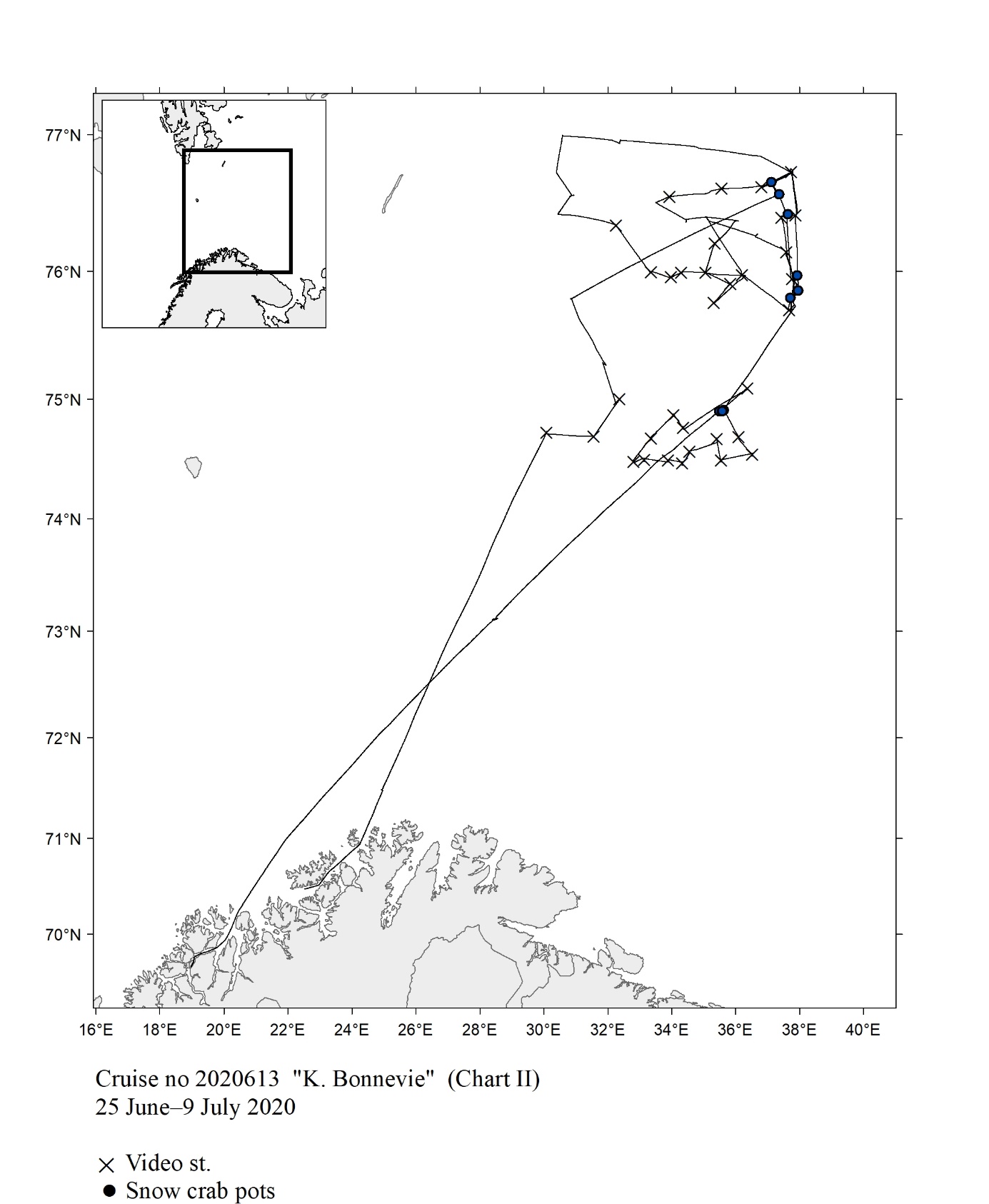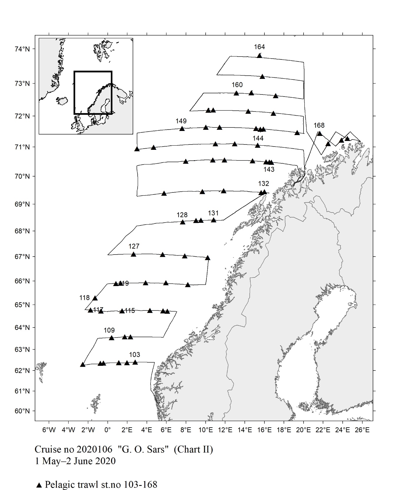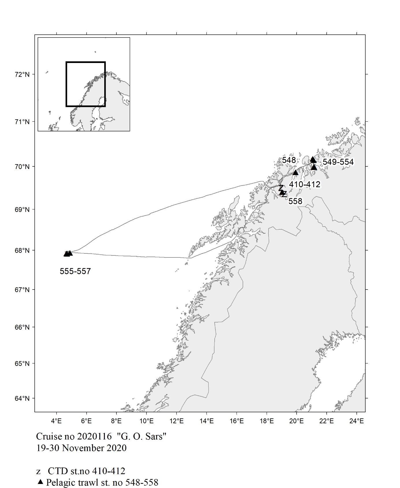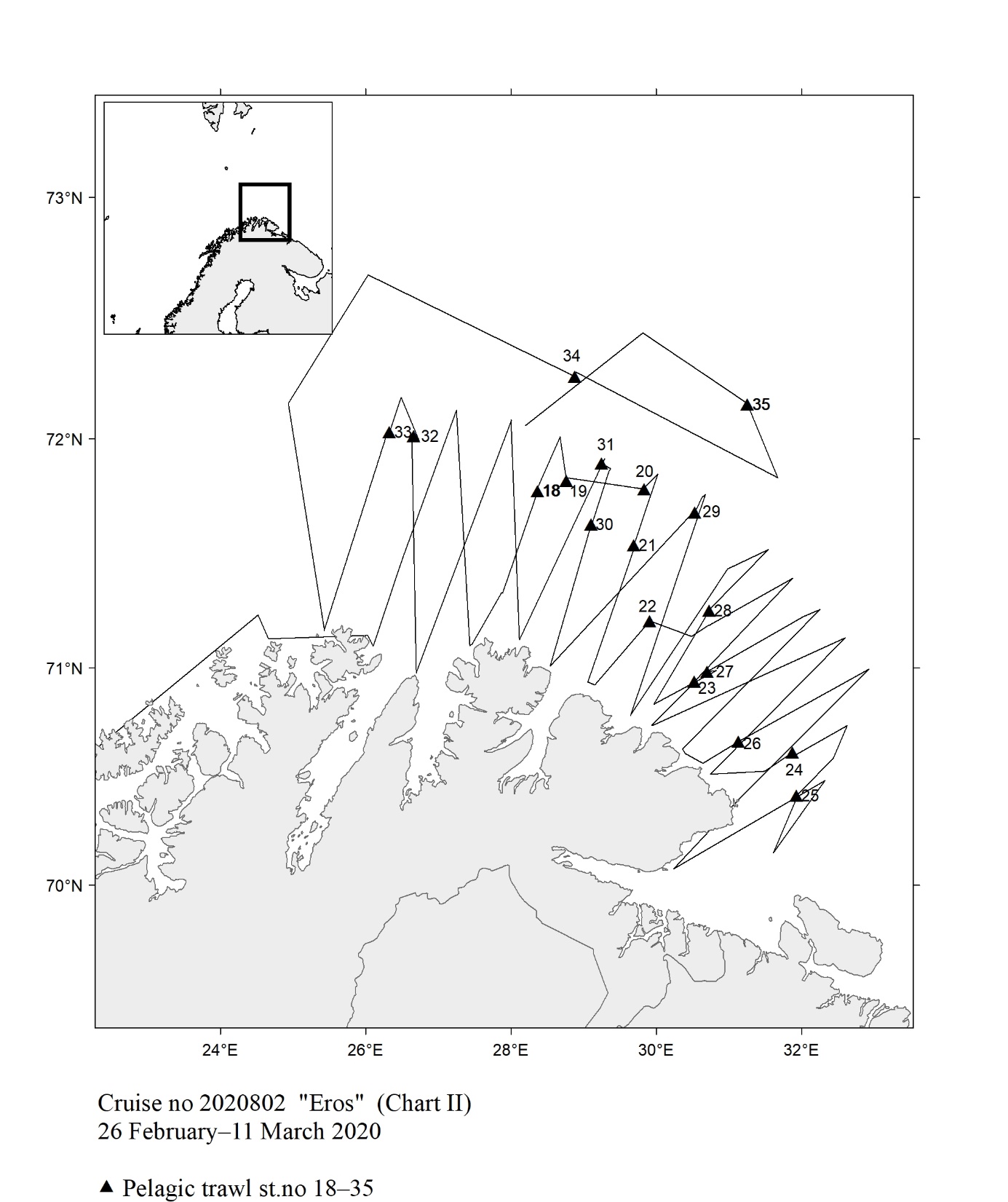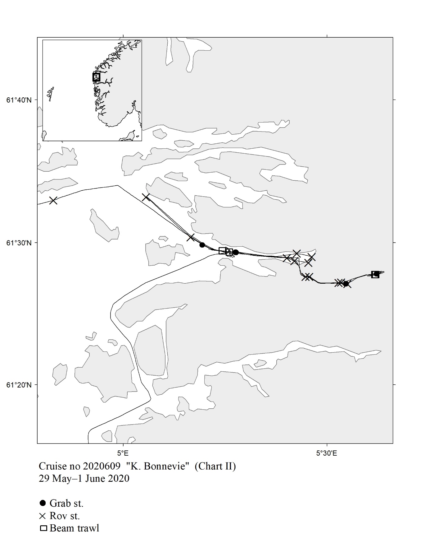 The report gives an overview of cruises in 2020, by the Institute of Marine Research, University of Bergen and Tromsø and Norwegian Polar Institute, Tromsø on board our research vessels and many of the hired commercial vessels. Each cruise is described by a short description and a track chart mainly showing CTD, plankton and trawl stations. The coverage of the oceanographic sections is listed in a table. Another table shows the number of observations per month for the fixed stations. Meta data about the cruises are reported to the International Council for the Exploration of the Sea (ICES) using the form “Cruise Summary Report”: http://www.seadatanet.org/Metadata/CSR . Research data (and chart) are available from the Norwegian Marine Data Centre at Institute of Marine Research. The charts can internally at IMR be downloaded from the Institute Intranet/Archive: http://hinnsiden.imr.no/ressurser/bilder/mediearkiv. Charts are made by Karen E. Gjertsen. Sebastian Bosgraaf made charts for “G.M.Dannevig”. There are no overview and maps for the cruises with our vessels "Fangst" and "Hans Brattstrøm".