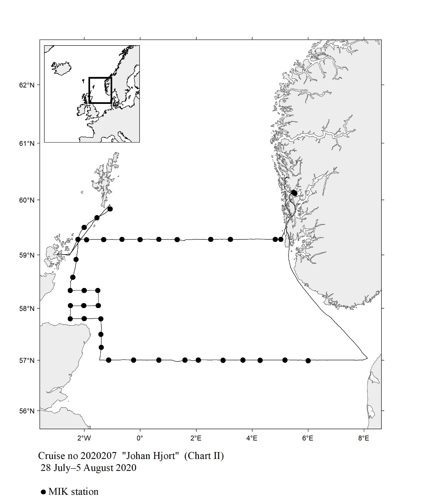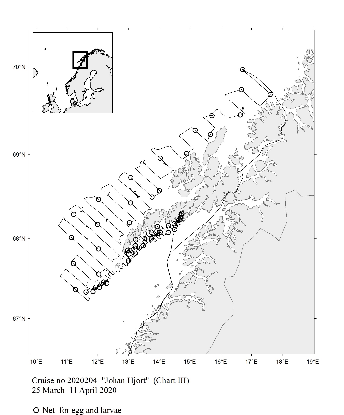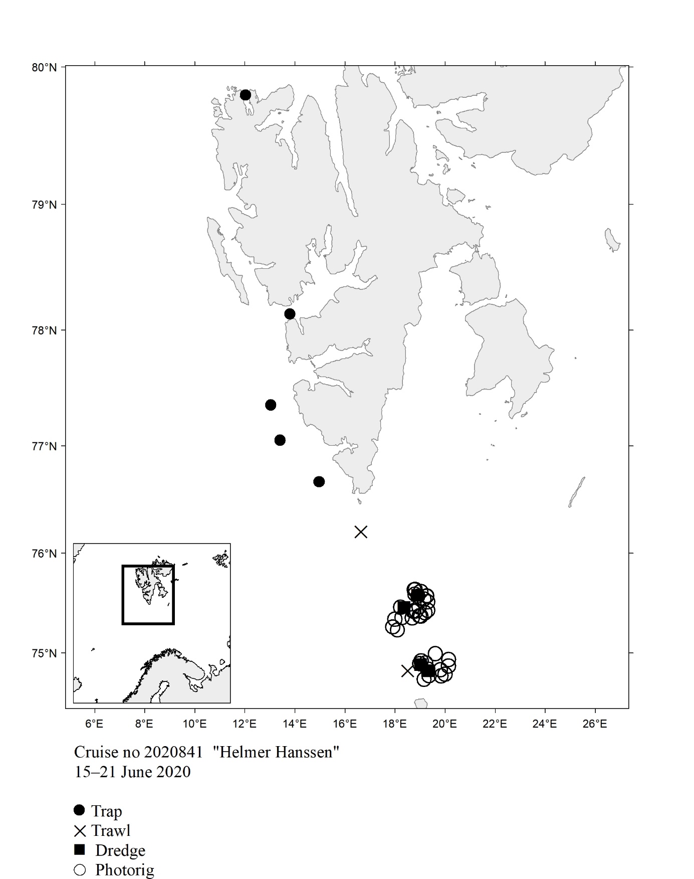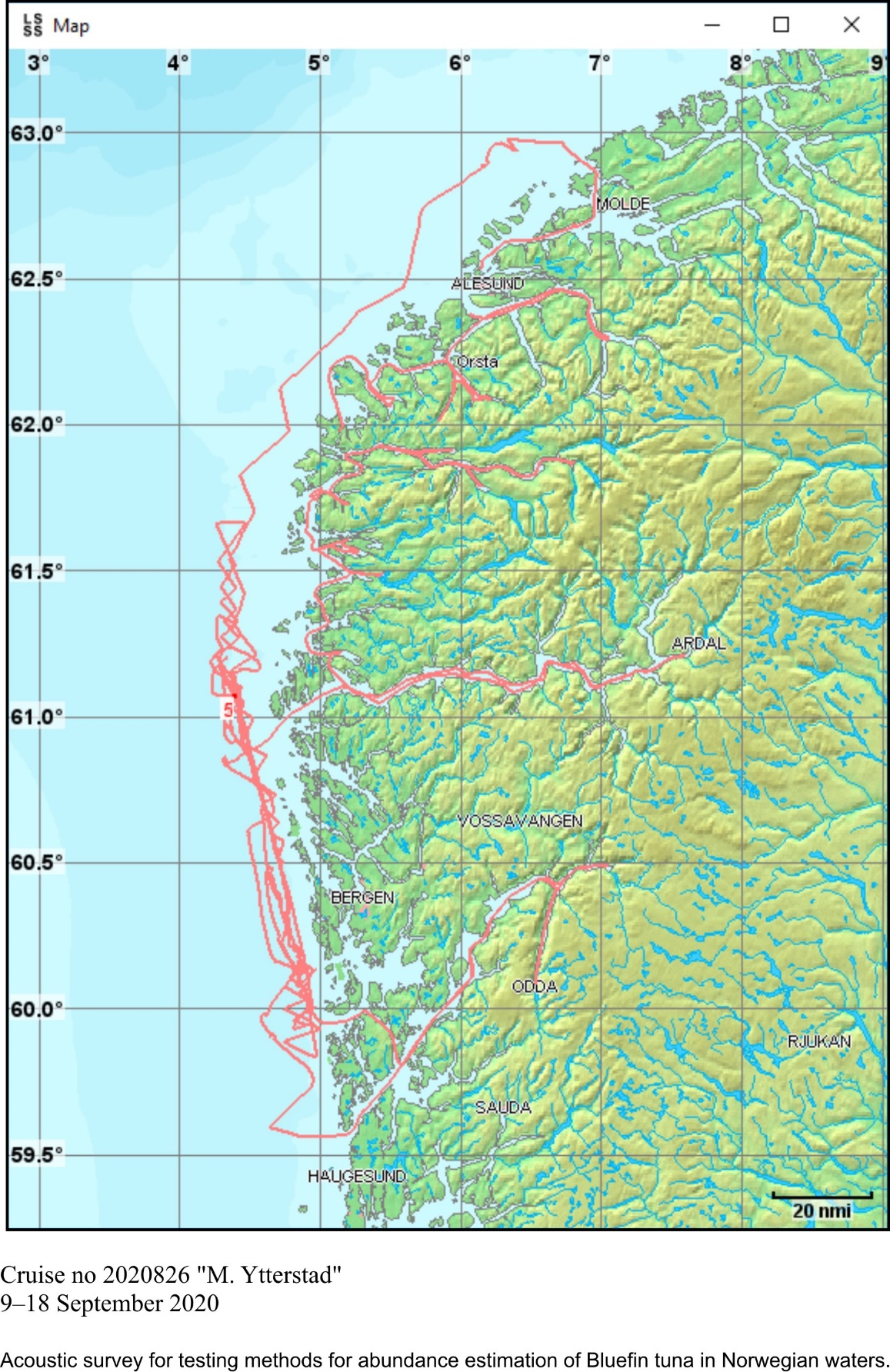 The report gives an overview of cruises in 2020, by the Institute of Marine Research, University of Bergen and Tromsø and Norwegian Polar Institute, Tromsø on board our research vessels and many of the hired commercial vessels. Each cruise is described by a short description and a track chart mainly showing CTD, plankton and trawl stations. The coverage of the oceanographic sections is listed in a table. Another table shows the number of observations per month for the fixed stations. Meta data about the cruises are reported to the International Council for the Exploration of the Sea (ICES) using the form “Cruise Summary Report”: http://www.seadatanet.org/Metadata/CSR . Research data (and chart) are available from the Norwegian Marine Data Centre at Institute of Marine Research. The charts can internally at IMR be downloaded from the Institute Intranet/Archive: http://hinnsiden.imr.no/ressurser/bilder/mediearkiv. Charts are made by Karen E. Gjertsen. Sebastian Bosgraaf made charts for “G.M.Dannevig”. There are no overview and maps for the cruises with our vessels "Fangst" and "Hans Brattstrøm".