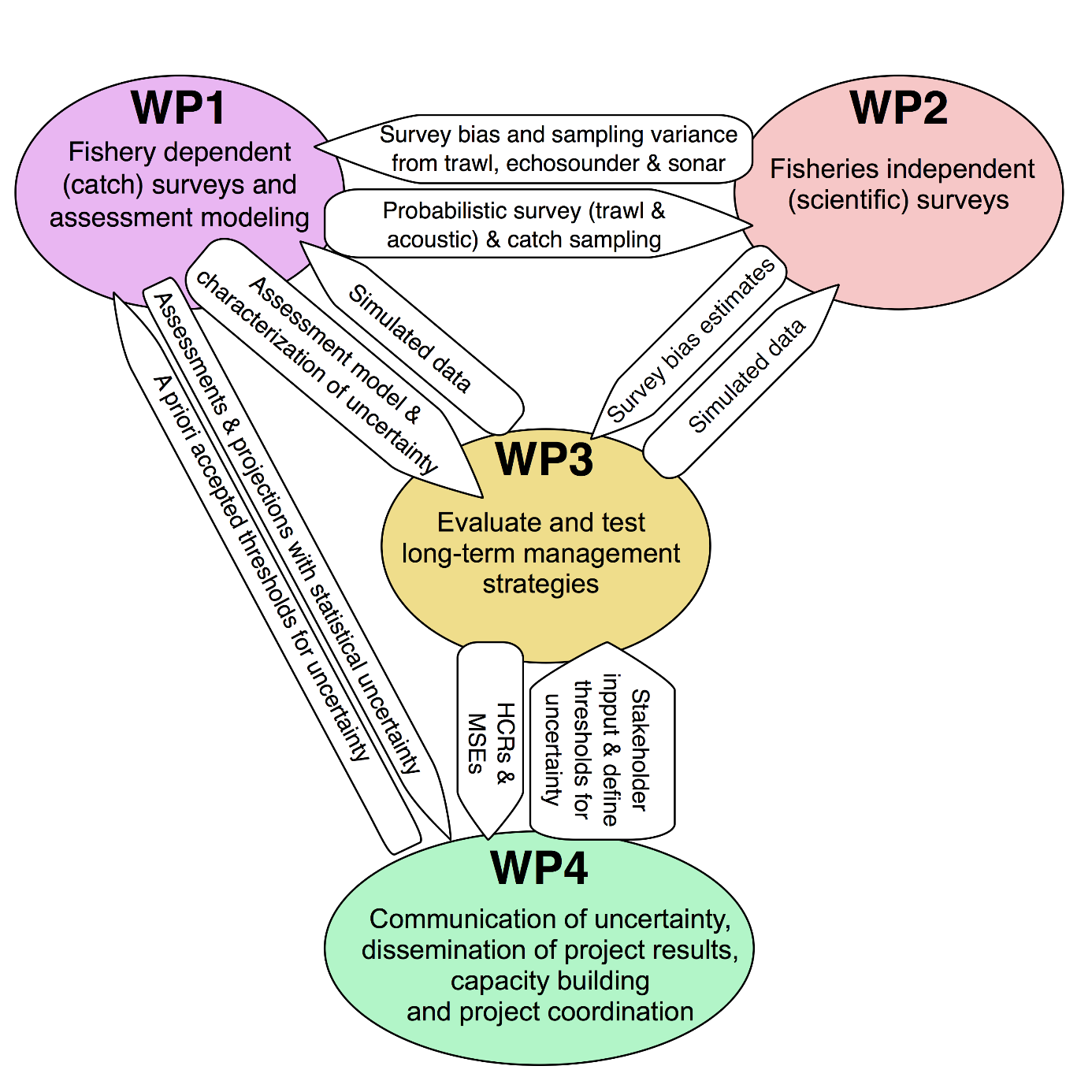 For Fiskeriavhengige (fangst) undersøkelser og bestandsvurderingsmodellering (WP1) var en av hovedresultatene bedre bestandsvurderingsmodeller. Dette ble oppnådd både ved å videreutvikle og implementere bestandsmodellen XSAM i WGWIDE sin bestandsvurdering av norsk vårgytende sild, og ved å bruke XSAM som en tilleggsmodell for nordøstarktisk torsk i AFWG. Gjennom samarbeid med DTU Aqua, har mye av funksjonaliteten til XSAM blitt implementert i SAM-koden, noe som har gjort det mulig å bruke strukturer fra begge modellene. Begrensningene i initialbetingelsene i bestandsvurderingsmodeller ble utforsket, f.eks. modellering med gjennomsnitt istedenfor modalverdi i SAM og inkludering av prosessfeil i fangstligningen i SAM. Et annet hovedresultat i WP1 var utviklingen og innføringen av sannsynlighetsbasert prøvetaking av fangster av pelagisk fisk, det såkalte «fangstprøvelotteriet», som gradvis har blitt utvidet fra å dekke kun sildefisket til å bli standard fangstprøvetaking for alle de pelagiske fiskeriene f.o.m. 2021. For å kunne estimere fangst i antall-per-alder basert på data fra fangstprøvelotteriet, har det blitt utviklet designbaserte estimatorer som har blitt inkludert i en R-pakke. I tillegg ble den modellbaserte estimatoren for fangst i antall-per-alder (ECA) som er standard for de store bunnfiskfiskeriene i Norge, videreutviklet som en R-pakke (R-ECA) og bygd inn i StoX.