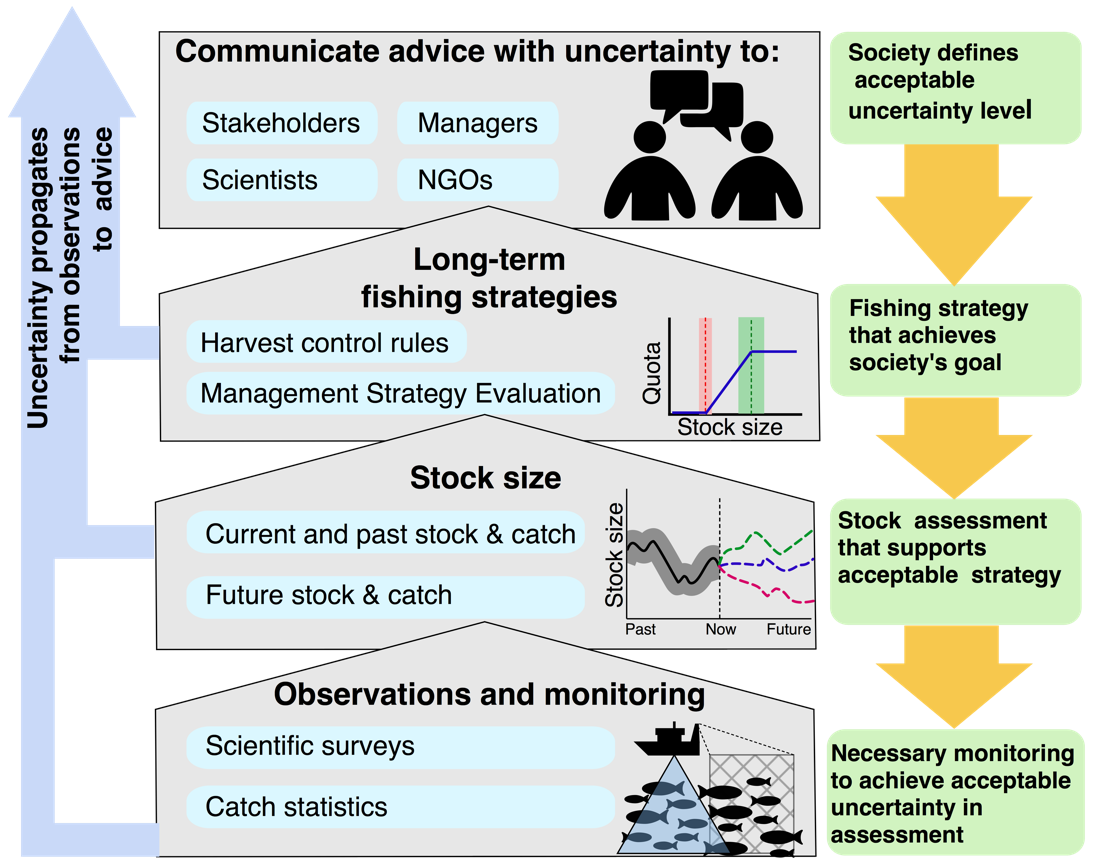 By quantifying uncertainty at each step in the assessment process, as well as the cumulative uncertainty, one can identify the greatest source of the overall uncertainty and focus research and development efforts where the gain is highest (reducing uncertainty the most). Conversely, by providing an uncertainty estimate with the final advice managers and decision-makers can set acceptable levels for uncertainty, that scientists can use to design and develop management strategies, harvest control rules, assessment methods, and ultimately monitoring schemes necessary to achieve the acceptable uncertainty levels. This can further be used to identify the resources needed (personnel, survey time etc.) to achieve this, which can be fed back to managers as the realistic cost of reducing uncertainties. Overall, this will create a greater transparency in the whole analytical assessment process, clarifying expectations from the recipients of advice as well as clarifying what the recipients can expect from the scientific advice.