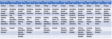 Figure 3.2: Survey design specifications for multi-stage catch sampling for the ICES Regional Database and Estimation system (RDBES). The catch sampling lottery is specified in hierarchy 13, with catch operation (haul) as primary sampling unit (PSU).