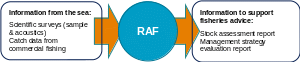 Figure 2.1: REDUS project objectives. Conceptual model of uncertainties at the different steps in a fisheries stock assessment process, which shows how uncertainties propagate (left blue arrow) and how management according to uncertainty can be used to identify the fishing strategies, stock assessment methods, and monitoring necessary to achieve the acceptable uncertainty level.