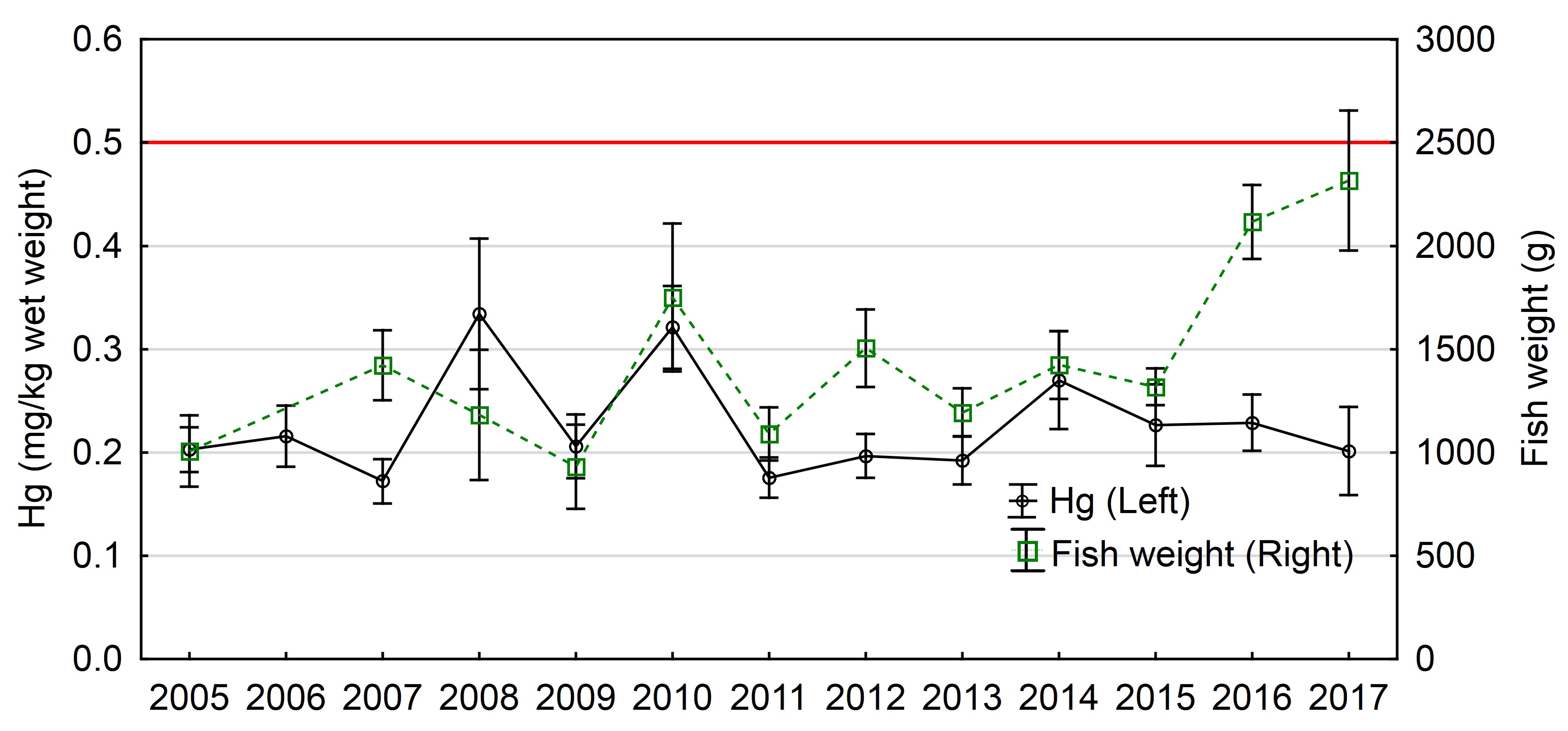Figur 3. Black solid line shows mercury concentrations (Hg, mg/kg wet weight) in fillet of tusk (Brosme brosme) caught at the wreck site of U-864 each year from 2005 to 2017, 25 fish each year except 2016 when 92 fish were analysed. Green broken line indicates fish weight (g). Means ± 95% confidence intervals are given, and the red line marks the EU and Norway’s maximum level for mercury in fish for human consumption.