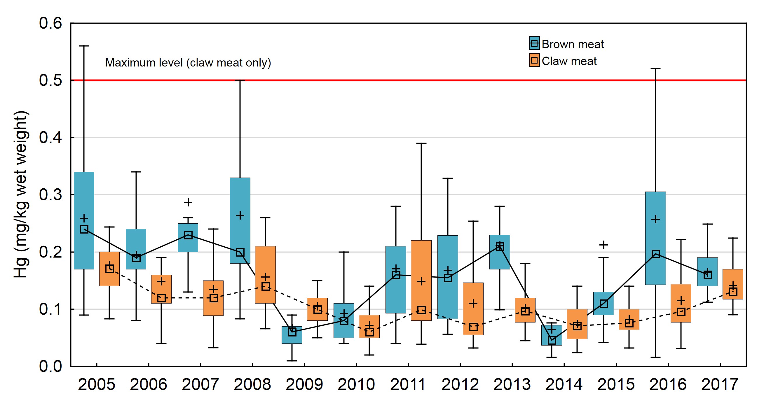I 2016 ble fem krabber analysert uten å kokes først og uten frysetørking, og disse hadde til dels svært høye konsentrasjoner av kvikksølv, men ikke metylkvikksølv, i hepatopankreas. Derfor ble det ved prøvetakingen i 2017 besluttet å opparbeide krabbe både på den vanlige måten med koking og uten koking. Som vanlig ble det tatt prøver av krabbe og brosme ved vraket samt fire nautiske mil sør for vraket og fire nautiske mil nord for vraket. For å fortsette de gode tidsseriene ble filet av brosme, samt klokjøtt og brunmat av kokte krabber analysert for totalkvikksølv. I tillegg analyserte vi klokjøtt og hepatopankreas av rå krabber. Brunmat av kokte krabber og hepatopankreas av rå krabber ble dessuten analysert for metylkvikksølv.